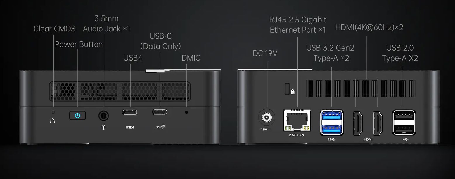 Minisforum UM773 tích hợp đầy đủ các cổng kết nối cần thiết trong một thân máy nhỏ gọn, bao gồm: bốn cổng USB Type-A (hai USB 3.2 Gen2 và hai USB 2.0), một cổng USB3.2 Gen2 Type-C (chỉ truyền dữ liệu), cổng Clear CMOS để đặt lại BIOS, một cổng DMIC, và một jack âm thanh 3.5mm kết hợp (combo jack). Sự đa dạng này đảm bảo khả năng kết nối với hầu hết các thiết bị ngoại vi hiện có, từ ổ cứng ngoài, máy in, đến các thiết bị âm thanh, mang lại sự tiện lợi tối đa cho người dùng.