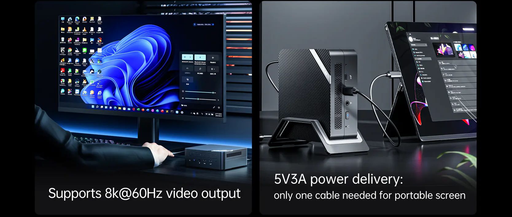 Thiết bị này có hai cổng HDMI (hỗ trợ 4K@60Hz) và một cổng USB4, cho phép kết nối đồng thời ba màn hình. Cấu hình hiển thị tối đa là một màn hình 8K@60Hz (qua USB4) và hai màn hình 4K@60Hz (qua HDMI). Khả năng hỗ trợ đa màn hình này cung cấp không gian làm việc rộng lớn, tăng năng suất cho các tác vụ đa nhiệm, hoặc tạo ra một trải nghiệm giải trí đa phương tiện sống động.