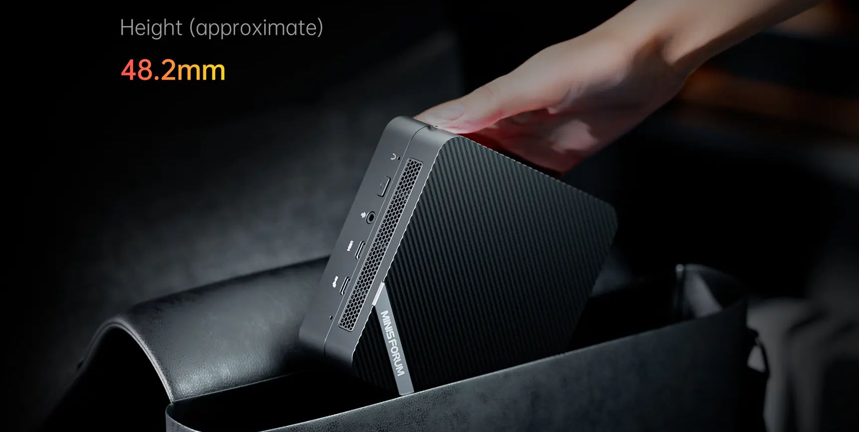 Minisforum UM773 gây ấn tượng mạnh với kích thước siêu nhỏ gọn, chỉ 128mm x 128mm x 48.2mm. Với trọng lượng nhẹ và thiết kế tinh tế, thiết bị này dễ dàng đặt gọn gàng dưới màn hình, gắn phía sau màn hình bằng giá đỡ VESA (nếu có), hoặc đơn giản là bỏ vào túi xách để mang theo khi di chuyển. Sự nhỏ gọn này không chỉ giúp giải phóng không gian bàn làm việc, mang lại sự gọn gàng và hiện đại cho mọi môi trường, mà còn tối ưu hóa tính di động, cho phép người dùng dễ dàng thiết lập không gian làm việc ở bất cứ đâu.