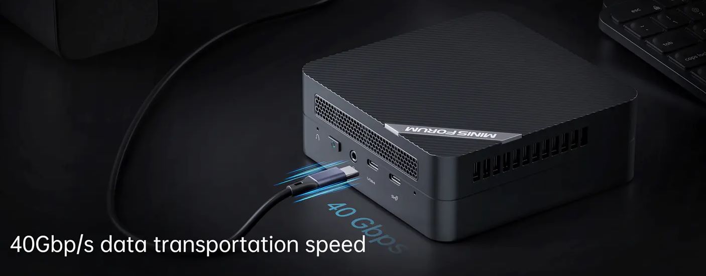 Minisforum UM773 Lite được trang bị một cổng USB4 tốc độ cao, mang lại khả năng kết nối tiên tiến và đa năng. Cổng này cung cấp tốc độ truyền dữ liệu lên đến 40Gbps, cực kỳ nhanh chóng cho việc sao chép các tệp lớn hoặc kết nối với các thiết bị ngoại vi hiệu suất cao. Đồng thời, USB4 hỗ trợ xuất hình ảnh lên đến độ phân giải 8K@60Hz, mang lại trải nghiệm hình ảnh sắc nét và chi tiết trên các màn hình tương thích. Một tính năng tiện lợi khác của cổng USB4 là khả năng cấp nguồn (5V3A) cho màn hình di động chỉ với một sợi cáp USB-C, giúp đơn giản hóa thiết lập di động và giảm số lượng dây cáp cần thiết. Tuy nhiên, cần lưu ý rằng cổng USB-C trên UM773 không thể dùng để cấp nguồn cho chính thiết bị; người dùng phải sử dụng bộ nguồn DC 19V đi kèm.
