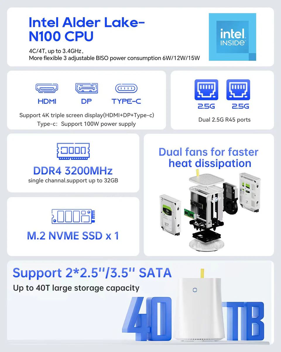 Về cấu hình phần cứng, AOOSTAR NAS R1 được trang bị vi xử lý Intel N100 thế hệ 12 (Alder Lake-N) với 4 nhân 4 luồng, tốc độ tối đa 3.4 GHz và bộ nhớ đệm 6MB. Đây là CPU mới kế thừa dòng Pentium/Celeron, cho hiệu năng đa nhiệm tốt trong khi tiêu thụ điện thấp (TDP 6W). Đi cùng CPU là bộ nhớ RAM 16GB DDR4 và ổ SSD M.2 NVMe 512GB (ở phiên bản đã lắp sẵn), đảm bảo hệ thống phản hồi nhanh. Đặc biệt, máy hỗ trợ mở rộng RAM lên đến 32GB qua khe SO-DIMM duy nhất, cùng khả năng lắp 2 ổ cứng SATA 3.5" hoặc 2.5" (tối đa 2 × 20TB, tổng 40TB) để lưu trữ dữ liệu lớn. Với cấu hình này, AOOSTAR NAS R1 không chỉ đáp ứng tốt nhu cầu lưu trữ của người dùng cá nhân mà còn đủ sức phục vụ các ứng dụng chuyên nghiệp đòi hỏi hiệu năng ổn định.