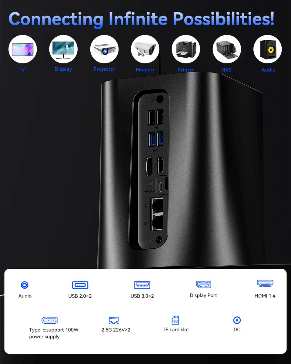 | Cổng IO | 2x USB 3.0 2x USB 2.0 1x HDMI 2.1 1x DP 1.4 (4k144Hz) 1x Type C(DP) 1x TF card 2x 2.5G |