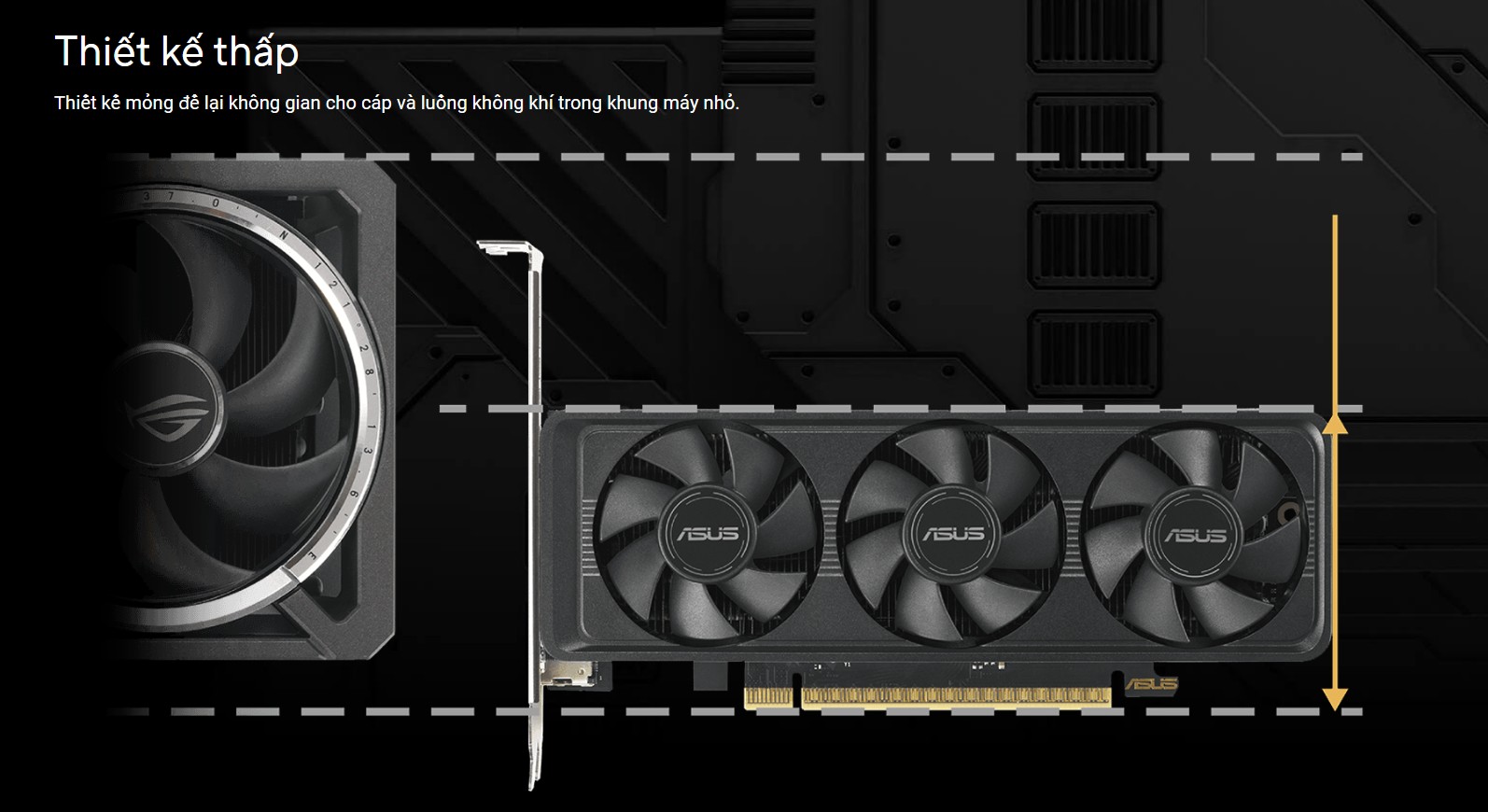 Dual-Slot (Hai khe): ASUS đã tối ưu hóa hệ thống tản nhiệt để chỉ chiếm hai khe cắm PCI, cân bằng giữa hiệu suất làm mát và khả năng tương thích.