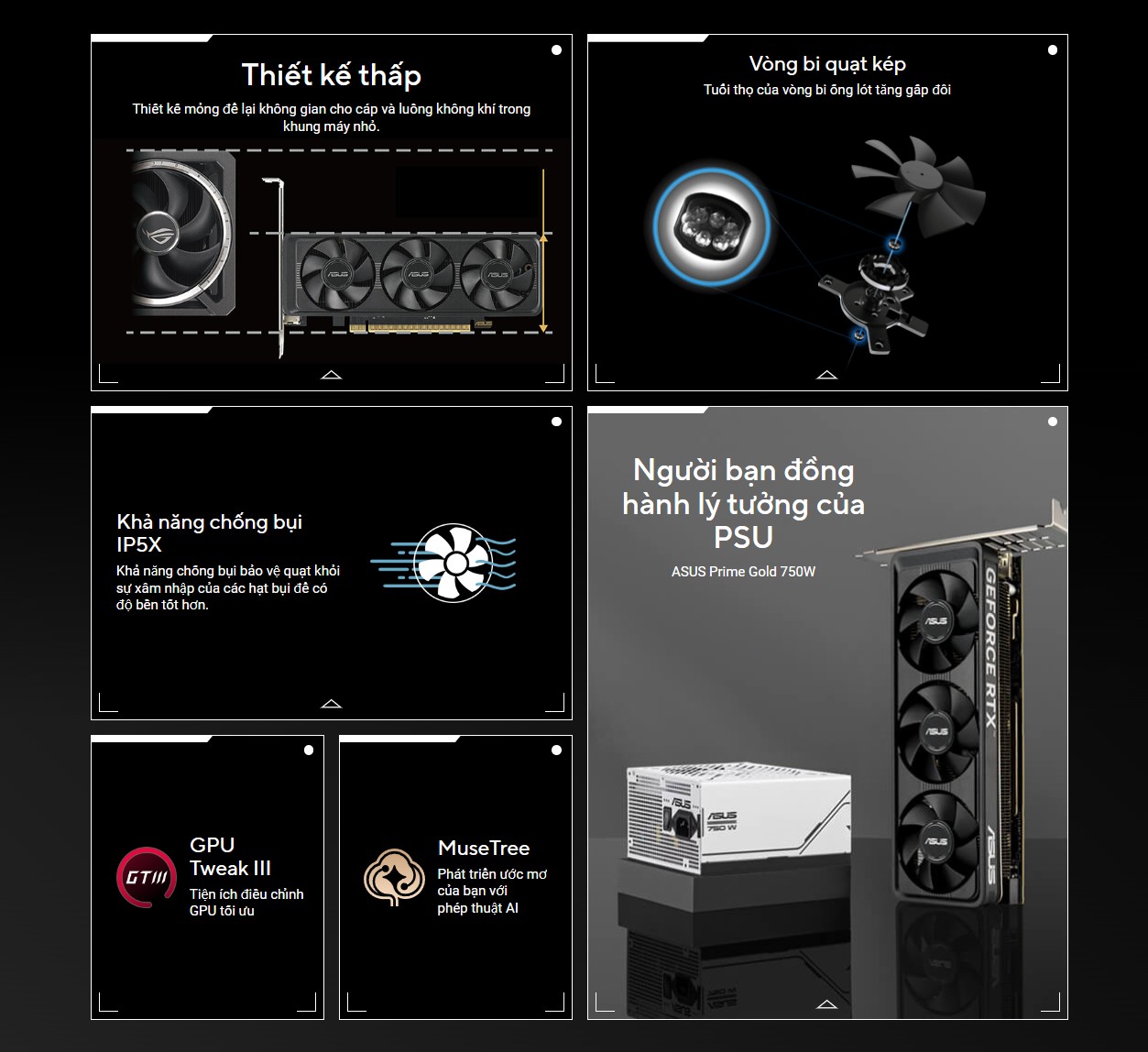 Độ ổn định: Quá trình ép xung được ASUS kiểm tra nghiêm ngặt, đảm bảo card hoạt động ổn định và bền bỉ trong suốt thời gian sử dụng.