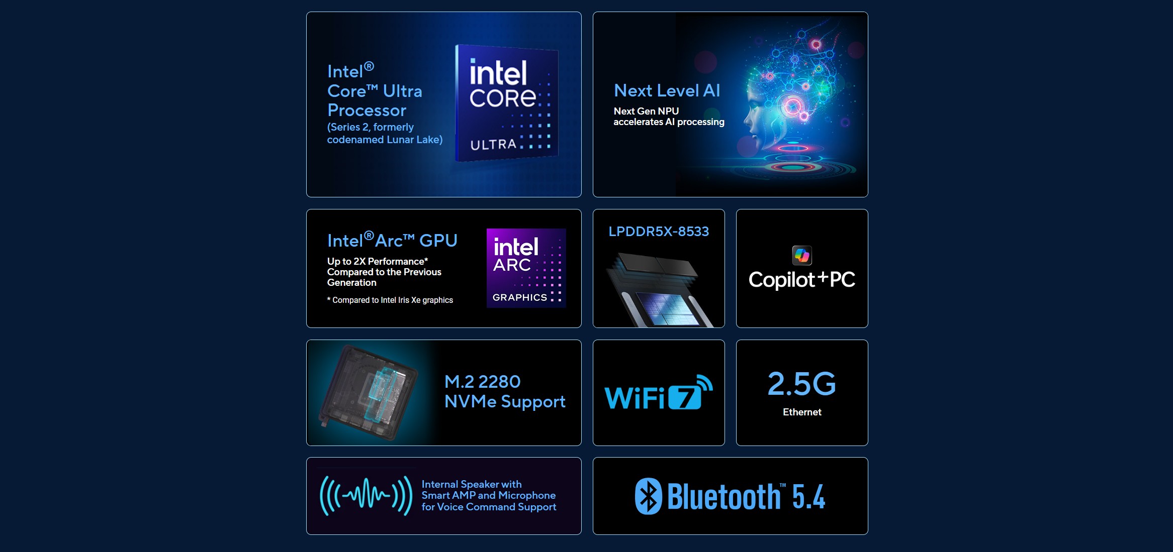 ASUS NUC 14 PRO AI được trang bị bộ vi xử lý Intel Core Ultra Series 2, bao gồm các mẫu như Ultra 5 226V, Ultra 5 258V, Ultra 7 256V, Ultra 7 258V, Ultra 9 288V. Với hiệu suất lên đến 120 TOPS trên các kiến trúc CPU, GPU, NPU, sản phẩm này cho phép bạn xử lý các tác vụ nặng như chỉnh sửa video 4K, render đồ họa 3D, hoặc chơi game với đồ họa cao cấp mà không gặp bất kỳ trở ngại nào. Hệ thống này mang lại sức mạnh tương đương một chiếc laptop cao cấp, nhưng trong một thiết kế siêu nhỏ gọn.
