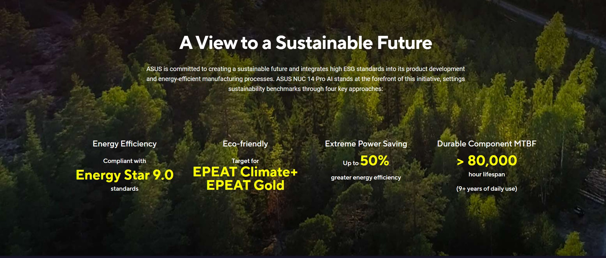 ASUS cam kết bảo vệ môi trường, và ASUS NUC 14 PRO AI tuân thủ tiêu chuẩn Energy Star 9.0 và EPEAT Gold, giúp tiết kiệm đến 50% năng lượng so với các thiết bị thông thường. Linh kiện có độ bền cao với tuổi thọ hơn 80.000 giờ (tương đương 9+ năm sử dụng hàng ngày), giảm thiểu tác động đến môi trường.