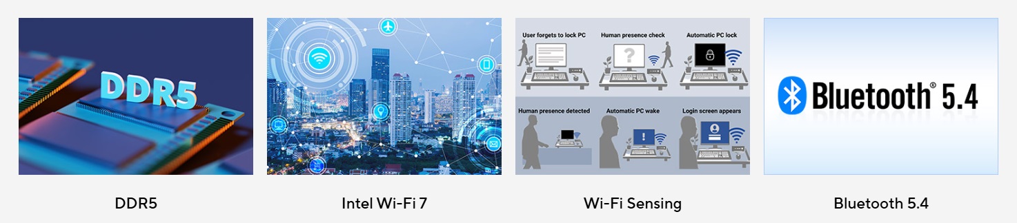 NUC 15 Pro RNUC15CRHU700000I hỗ trợ Intel WiFi 7, Intel WiFi Proximity Sensing, và Bluetooth® 5.4, mang lại khả năng kết nối nhanh chóng và ổn định.