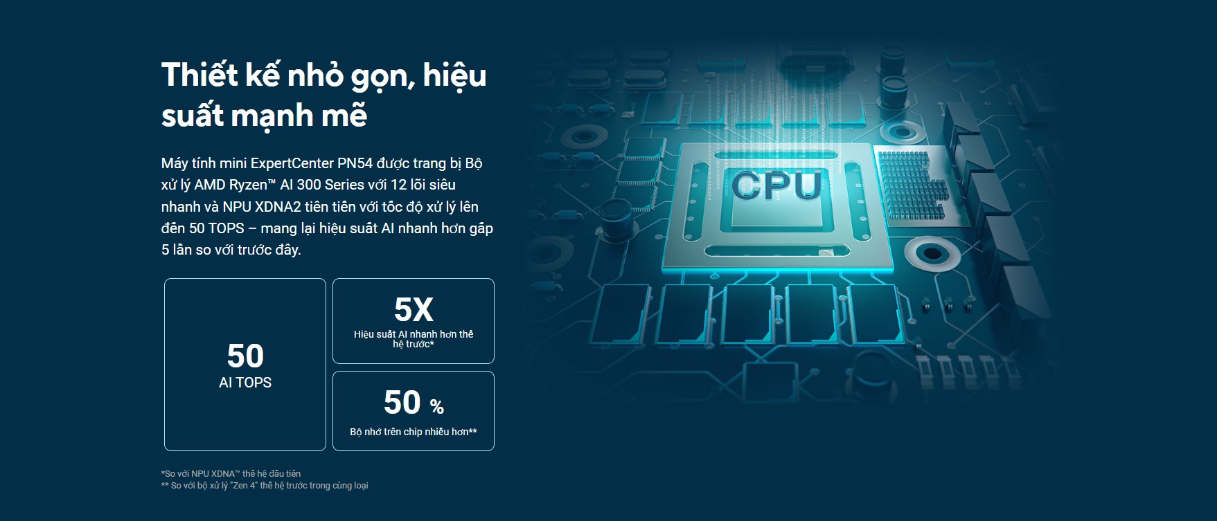 ASUS NUC AI 350 (PN54) được trang bị bộ vi xử lý AMD Ryzen™ AI 300 Series với tối đa 12 lõi siêu nhanh và kiến trúc XDNA2 NPU, cung cấp hiệu suất AI lên đến 50 TOPS. So với thế hệ XDNA™ đầu tiên, ASUS NUC AI 350 (PN54) mang lại hiệu suất AI nhanh hơn gấp 5 lần, đảm bảo xử lý mượt mà các tác vụ AI phức tạp như tạo nội dung, phân tích dữ liệu lớn, và tối ưu hóa quy trình làm việc. Bộ vi xử lý này được tối ưu hóa cho các ứng dụng AI mới nhất và hệ điều hành Windows, mang đến trải nghiệm mượt mà, nhanh chóng và thông minh hơn.