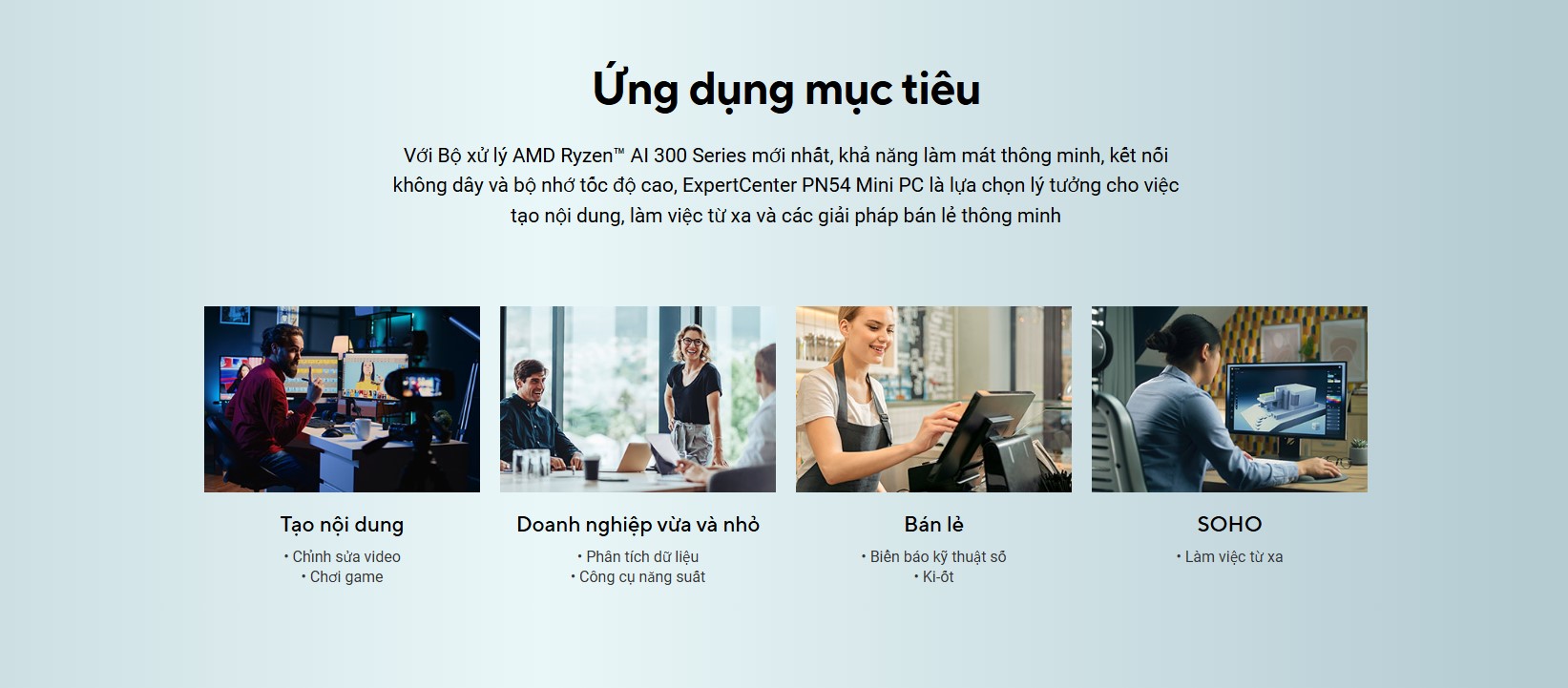 ASUS ExpertCenter PN54 là giải pháp toàn diện cho nhiều lĩnh vực, từ văn phòng hiện đại, bán lẻ thông minh, đến giải trí tại gia. Với khả năng hỗ trợ AI cục bộ, sản phẩm đảm bảo bảo mật dữ liệu tối ưu, đặc biệt quan trọng đối với các doanh nghiệp xử lý thông tin nhạy cảm. PN54 còn lý tưởng cho các nhà sáng tạo nội dung, với khả năng xử lý các tác vụ như chỉnh sửa video 4K, tạo hình ảnh bằng AI, và quản lý dữ liệu lớn.