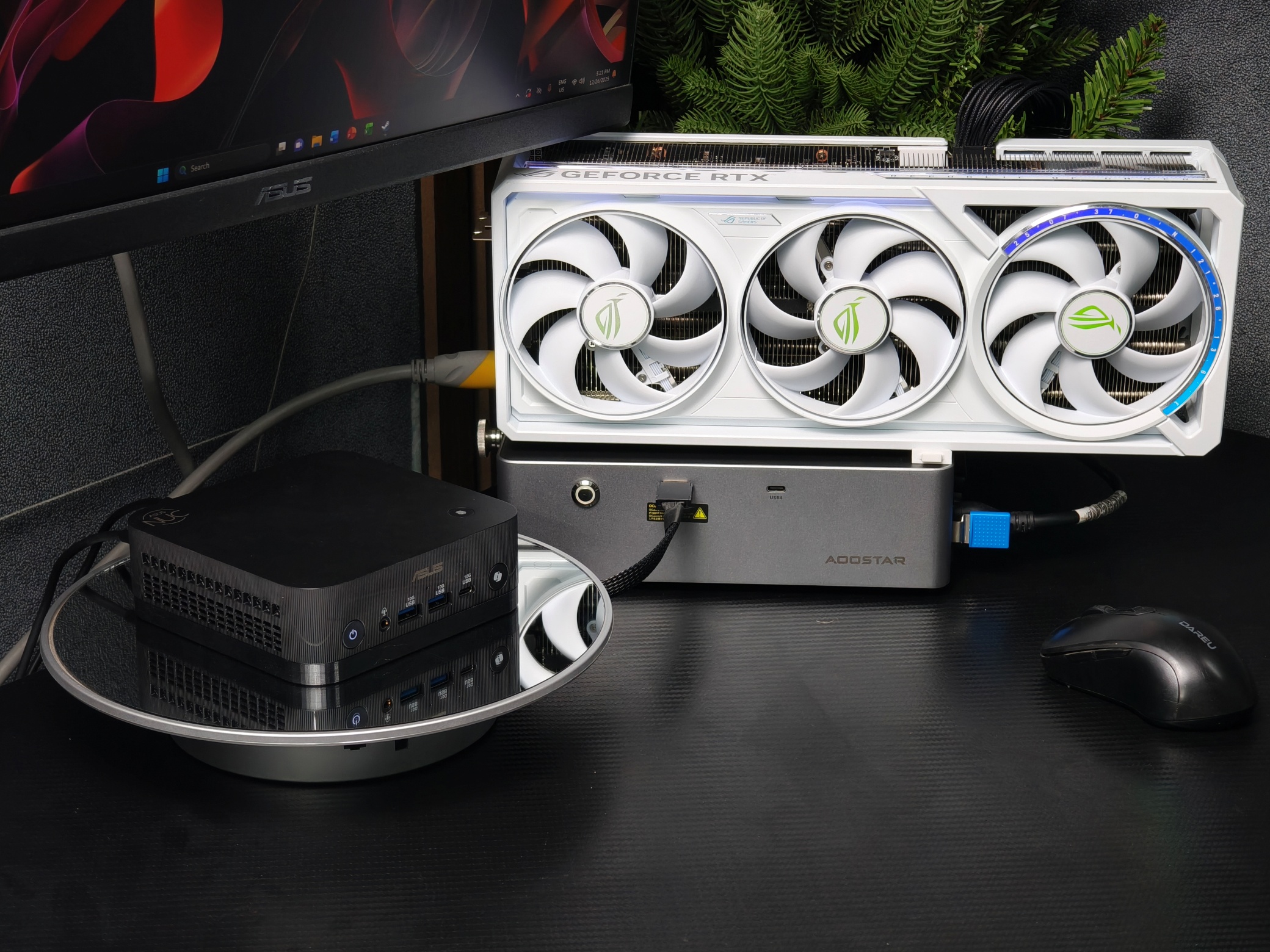 Một vấn đề lớn của Mini PC khi chạy đồ họa nặng là nhiệt độ. Bằng cách đưa GPU ra ngoài thông qua eGPU kết nối Oculink, áp lực tản nhiệt lên ASUS NUC AI 350 được giảm bớt đáng kể.