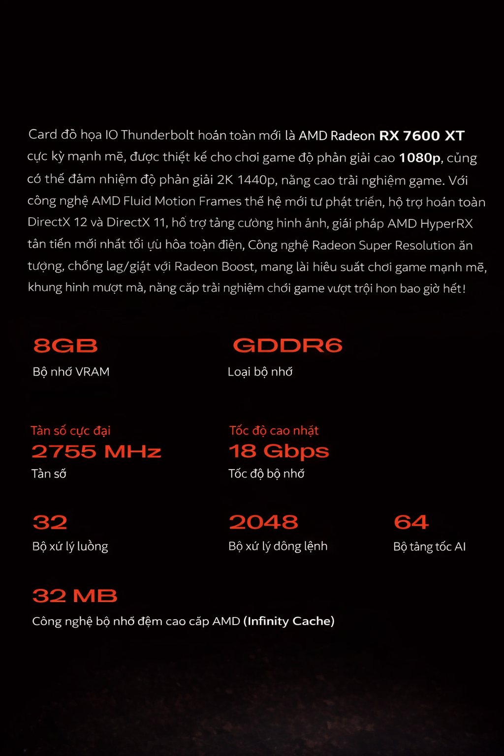 • Hiệu Suất Đồ Họa Ấn Tượng: AMD Radeon RX-7600XT | 7600M 8GB mang lại hiệu suất đồ họa mạnh mẽ, cho phép bạn chơi game và làm việc với đồ họa ở mức cài đặt cao nhất mà không lo giật lag.