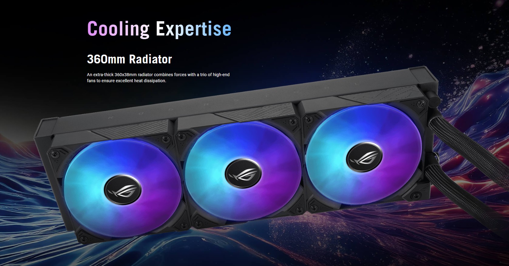 Quạt Tản Nhiệt: Sử dụng quạt ROG cao cấp được tối ưu hóa cho áp suất tĩnh và lưu lượng gió, giúp giữ nhiệt độ chất lỏng ở mức thấp nhất, ngay cả dưới tải nặng liên tục trong thời gian dài.