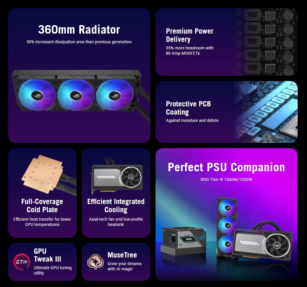 Hiệu suất AI Tối đa: Với hiệu suất AI lên tới hàng ngàn TOPS (Tera Operations Per Second), ROG Astral LC RTX 5090 trở thành một Workstation AI mini, hỗ trợ đắc lực cho các nhà phát triển AI, các tác vụ học máy (Machine Learning) và các công cụ sáng tạo dựa trên AI như MuseTree của ASUS.