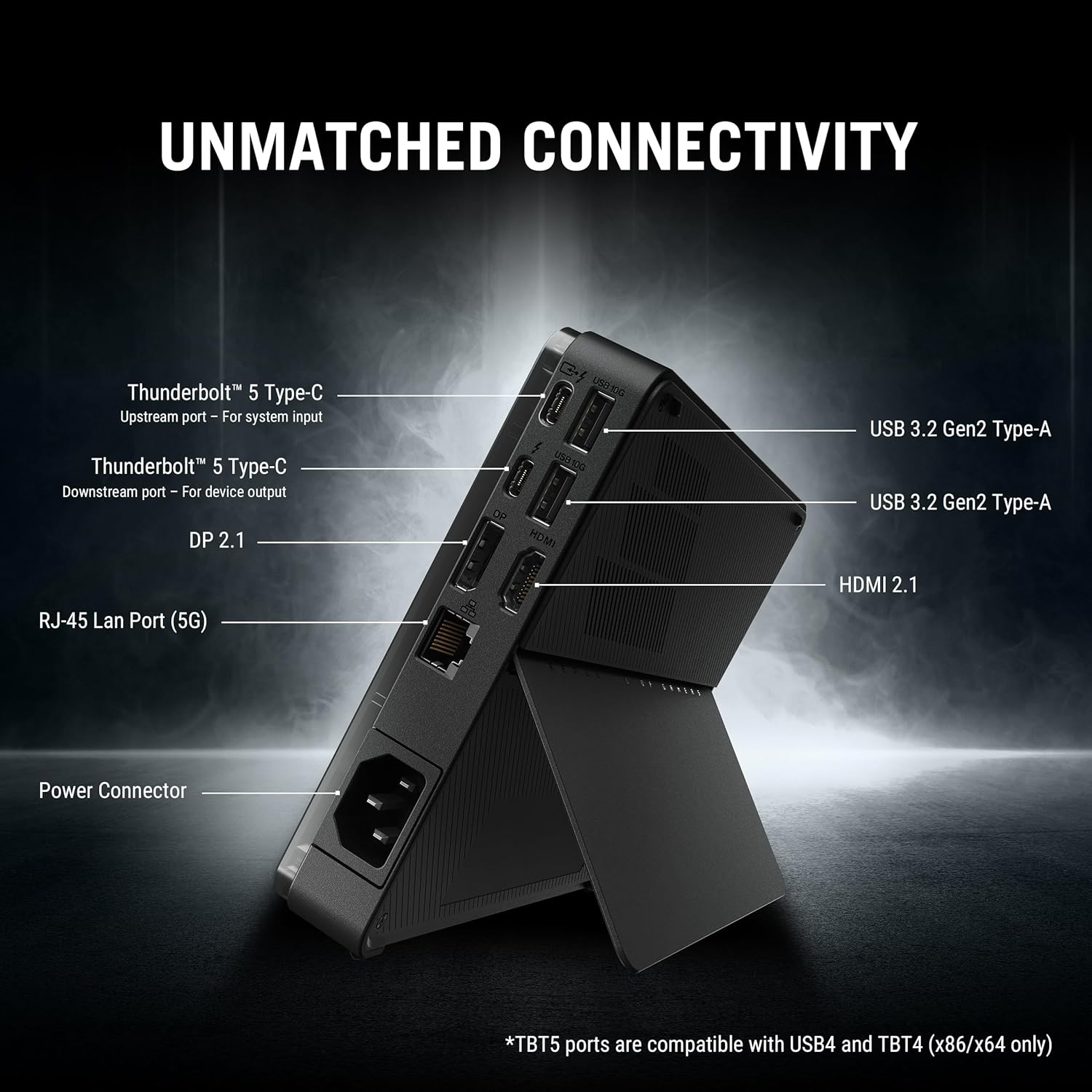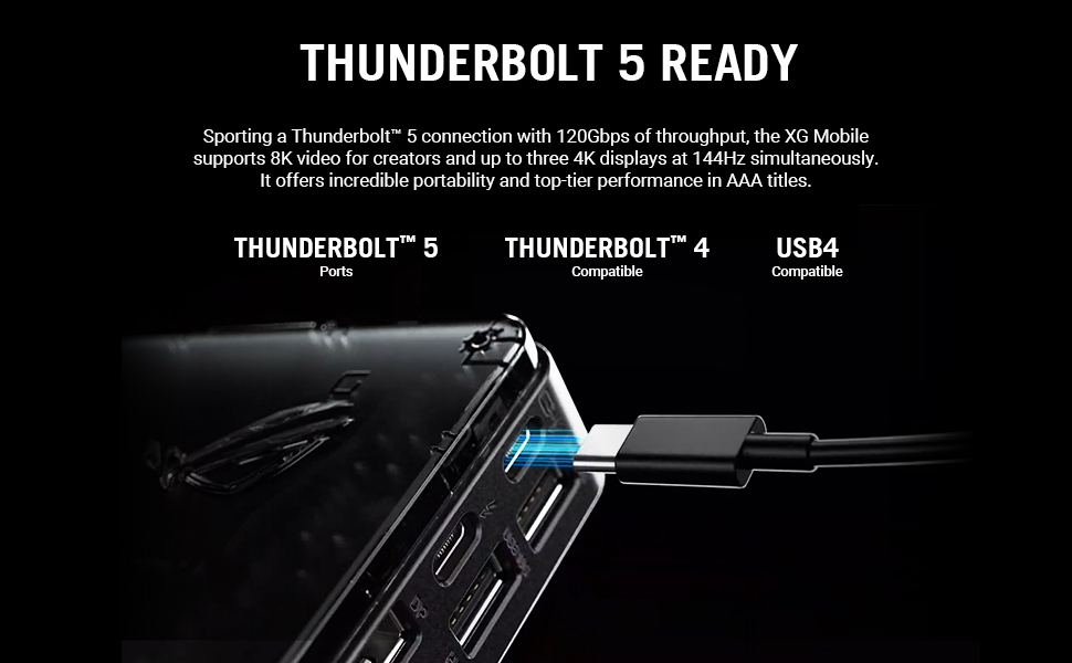 Việc áp dụng Thunderbolt™ 5 giúp ASUS ROG XG Mobile GC34R tương thích tốt hơn với nhiều thiết bị gaming và sáng tạo của ROG (cần hỗ trợ ít nhất Thunderbolt™ 4 hoặc USB4® và chip x86/x64), bao gồm các dòng laptop ROG Flow và các thiết bị cầm tay như ROG Ally thế hệ mới (tùy thuộc vào bản cập nhật).