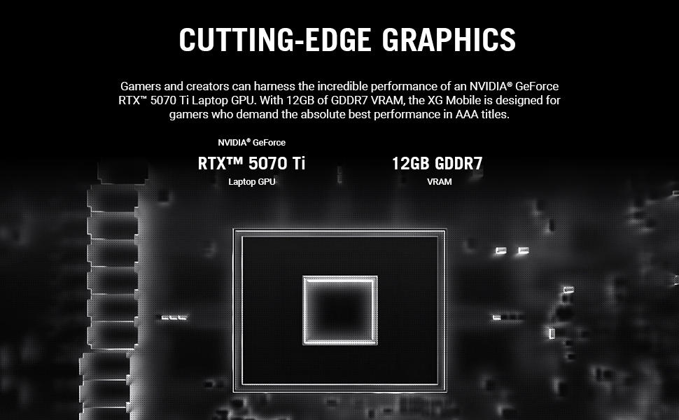Mẫu GC34R đỉnh cao được trang bị GPU NVIDIA® GeForce RTX™ 5070ti Laptop GPU – đại diện cho sức mạnh đồ họa di động. Với kiến trúc Blackwell tiên tiến, XG Mobile cung cấp: