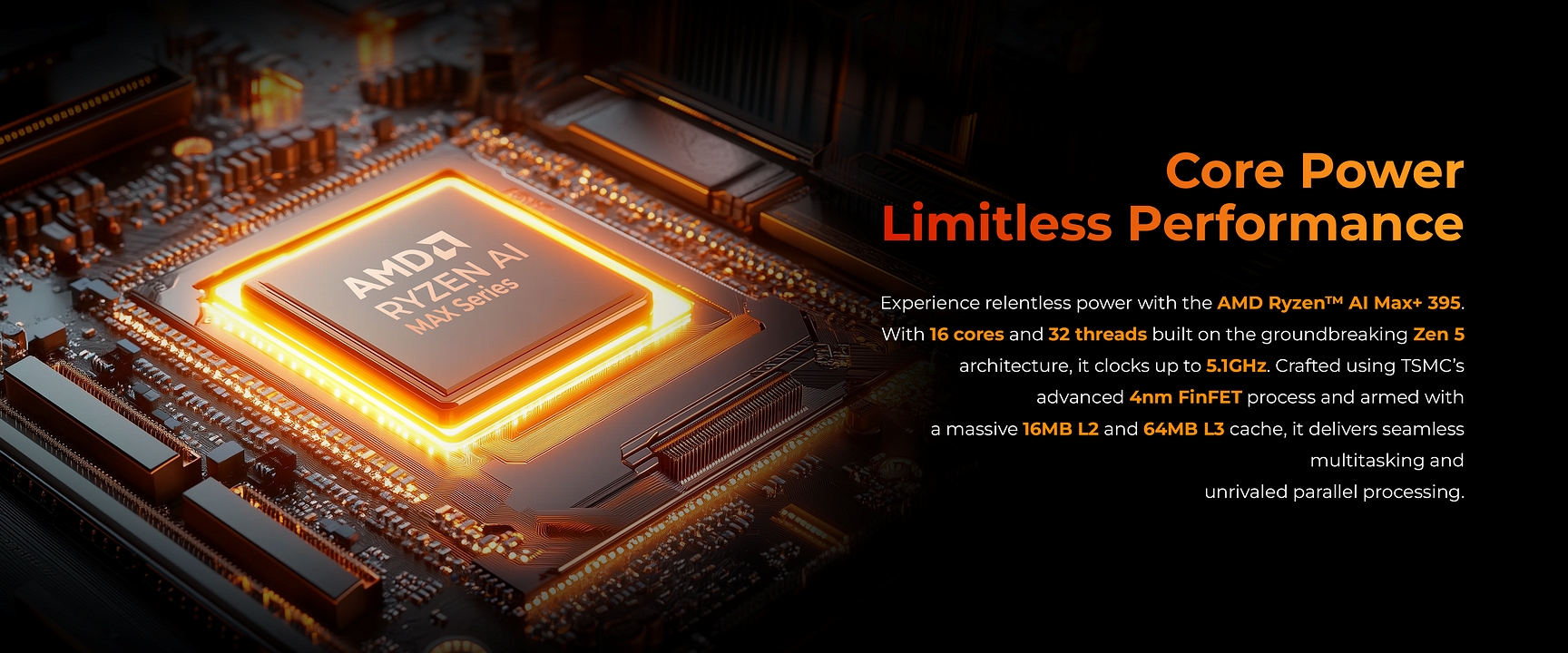 Trái tim của GMK EVO-X2 AI MAX+ 395 là AMD Ryzen™ AI Max+ 395, sở hữu 16 nhân và 32 luồng dựa trên kiến trúc Zen 5. Bộ vi xử lý này đạt tốc độ xung nhịp tối đa 5.1GHz, được sản xuất trên quy trình 4nm FinFET của TSMC.