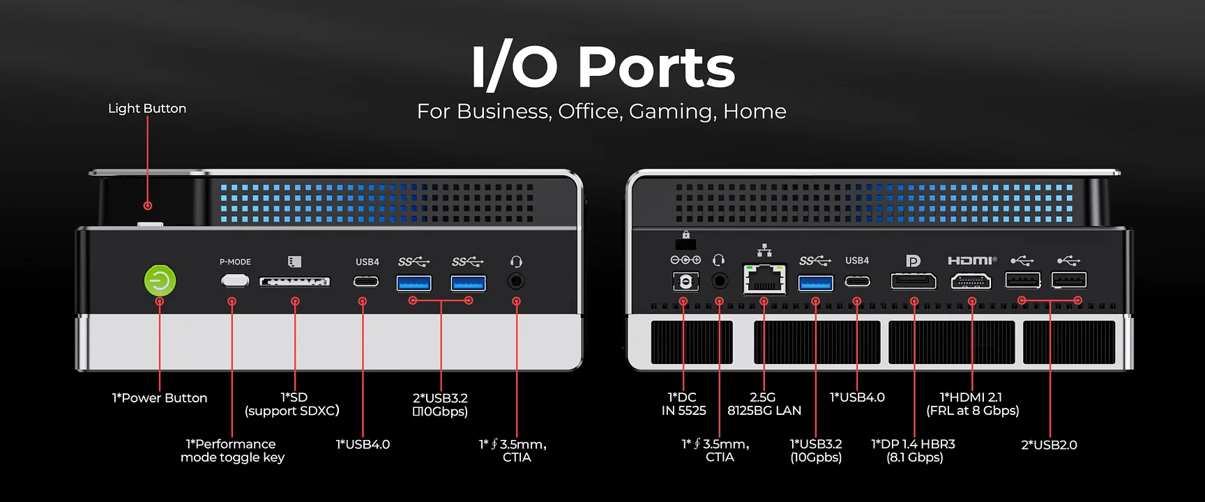 | Cổng IO | 2× USB-A 2.0 1× DisplayPort 1.4 1× HDMI 2.1 1× USB-A 3.2 Gen2 2× USB Type-C (USB4.0) 1× Audio 1× DC IN 1× RJ45 Gigabit LAN |