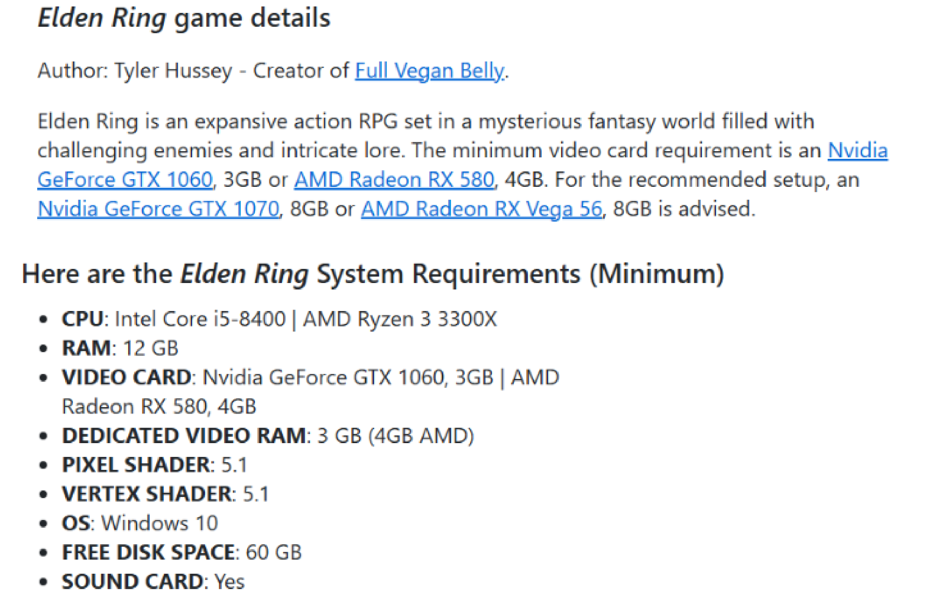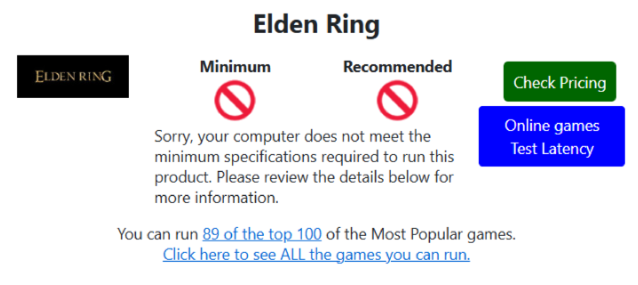 Ví dụ: Tìm kiếm "Elden Ring" → hệ thống sẽ hiển thị yêu cầu về CPU, RAM, GPU, dung lượng ổ cứng.