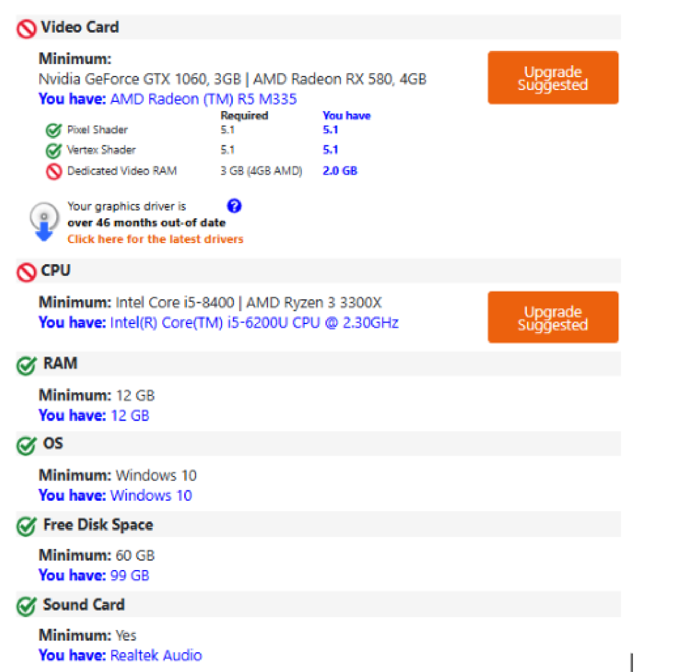 - FAIL(Đỏ): Cấu hình không đạt, hệ thống gợi ý phần cứng cần nâng cấp (VD: RAM 8GB → 16GB, GPU yếu cần thay thế).