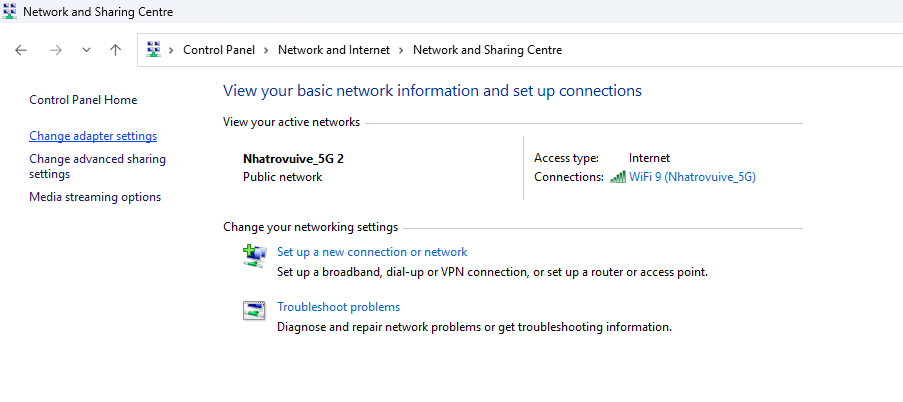- Mở Control Panel → Network and Internet → Network and Sharing Center