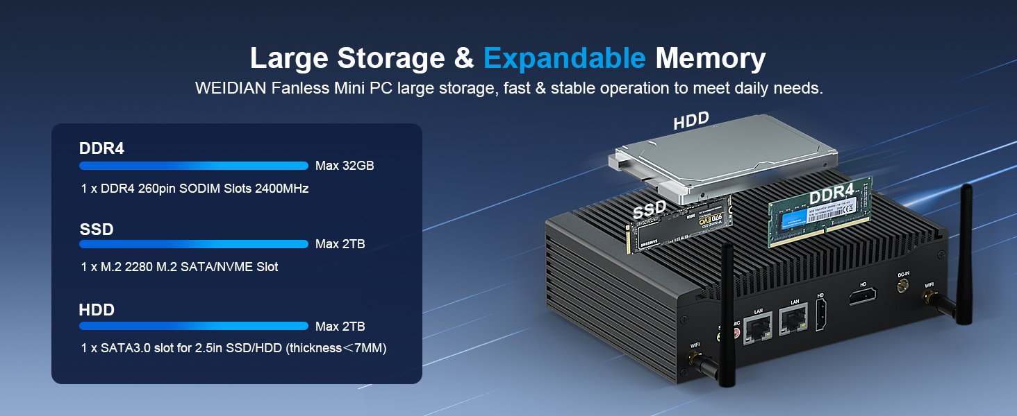 Bên cạnh CPU mạnh, máy tính được trang bị RAM DDR4 dung lượng lớn giúp tăng băng thông bộ nhớ, cho phép xử lý nhiều tác vụ đồng thời một cách mượt mà. Về lưu trữ, HYSTOU i5-8350U hỗ trợ đa dạng các chuẩn ổ đĩa: có khe cắm M.2 SSD (NVMe hoặc SATA) tốc độ cao, khe 2.5-inch SATA để lắp ổ SSD/HDD truyền thống. Cấu hình linh hoạt này cho phép bạn kết hợp ổ SSD tốc độ cao với ổ HDD dung lượng lớn, vừa đảm bảo tốc độ truy xuất dữ liệu, vừa có không gian lưu trữ dồi dào cho ứng dụng máy tính nhúng của mình.