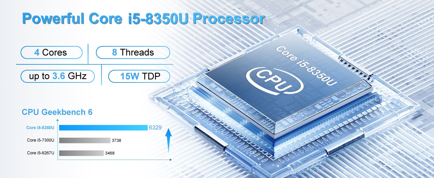 Trái ngược với ngoại hình nhỏ bé, HYSTOU i5-8350U sở hữu cấu hình rất mạnh mẽ nhờ bộ vi xử lý Intel Core i5-8350U thế hệ thứ 8. Đây là CPU 4 nhân 8 luồng, tốc độ xung nhịp tối đa lên đến ~3.6GHz, đủ sức đáp ứng các tác vụ đa nhiệm và ứng dụng công nghiệp phức tạp. Hiệu năng Intel Core i5 cho phép mini PC này xử lý tốt từ công việc văn phòng, đồ họa 2D/3D nhẹ cho đến thu thập và phân tích dữ liệu trong nhà máy.
