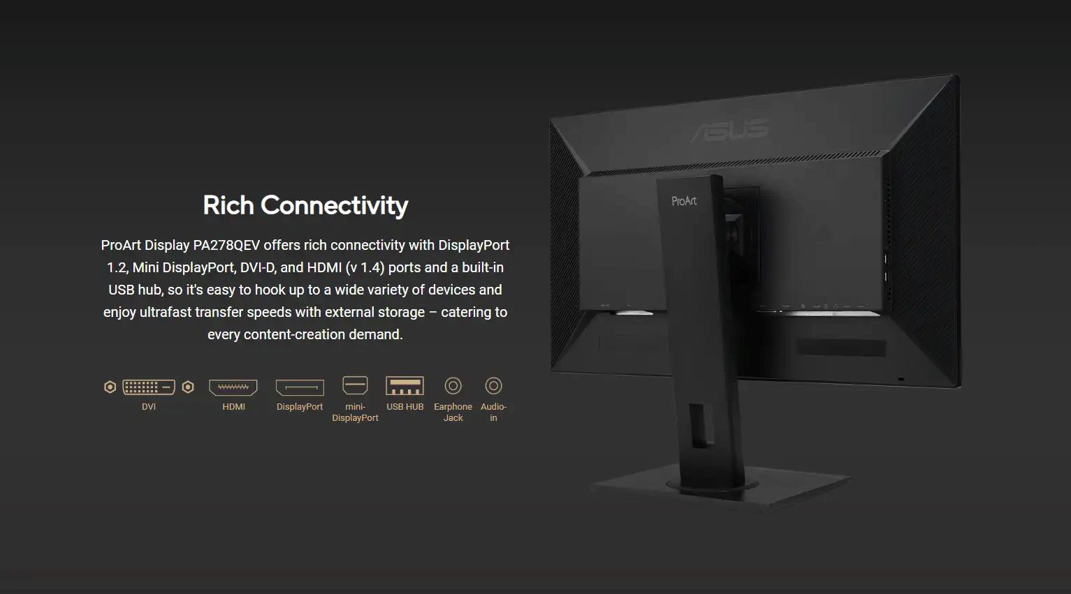Màn hình PA278QEV nổi bật với sự phong phú của các cổng kết nối, biến nó thành một trung tâm điều khiển linh hoạt cho mọi hệ thống. Sản phẩm được trang bị các cổng DisplayPort 1.2, Mini DisplayPort, HDMI 1.4, và Dual-Link DVI, cùng với một hub USB 3.2