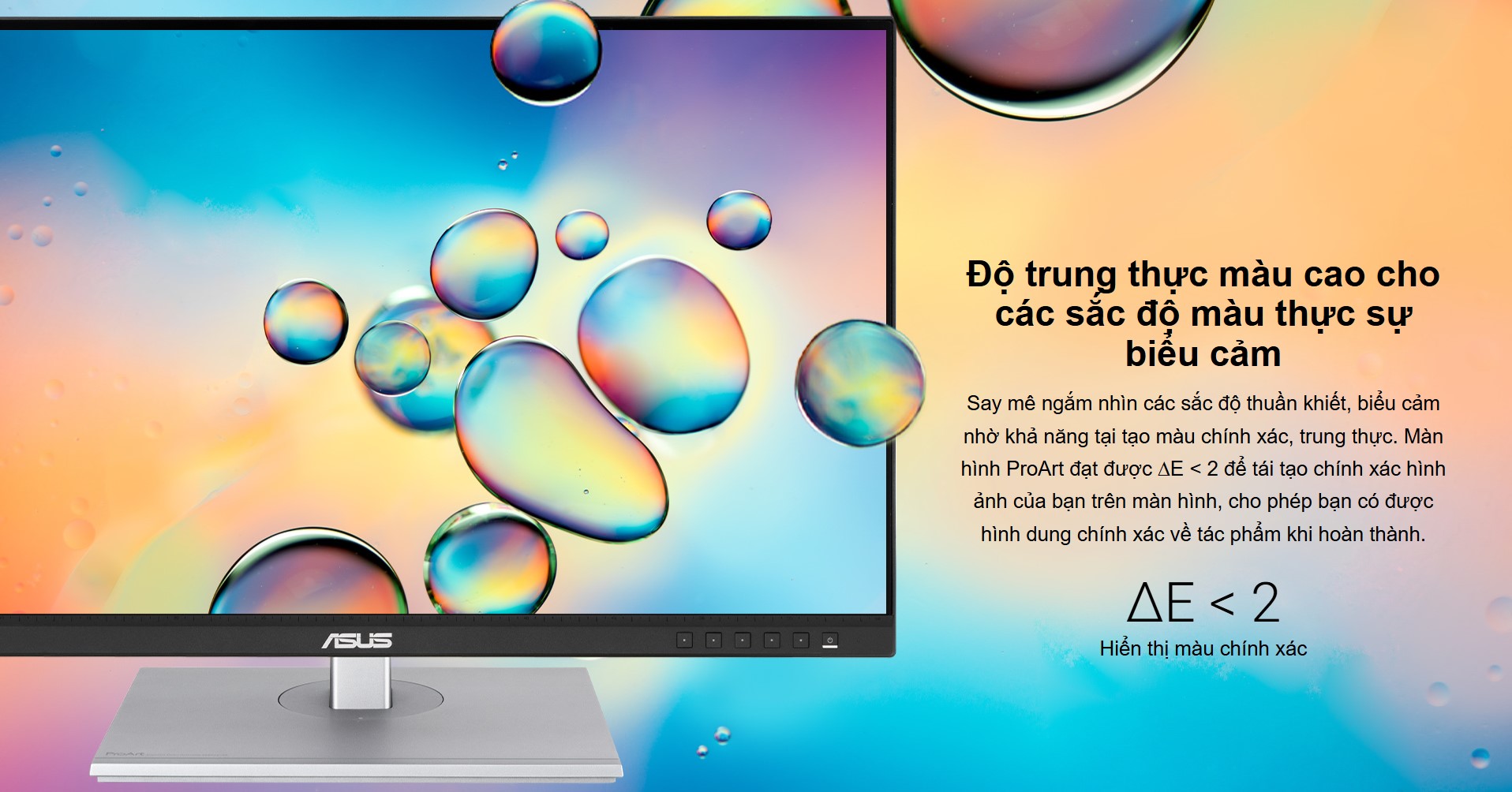 Đối với mọi công việc sáng tạo, màu sắc là yếu tố tối quan trọng. Màn hình ASUS ProArt PA278QEV được hiệu chỉnh tại nhà máy và đạt chứng nhận Calman Verified, đảm bảo độ chính xác màu sắc vượt trội ngay từ khi mở hộp. Với chỉ số sai lệch màu E < 2, màn hình này tái hiện màu sắc với độ chân thực cao, đến mức sự khác biệt khó có thể nhận biết bằng mắt thường. Điều này mang lại sự tự tin tuyệt đối cho người dùng, đảm bảo rằng màu sắc hiển thị trên màn hình sẽ nhất quán và chuẩn xác với thành phẩm cuối cùng, tiết kiệm thời gian và loại bỏ sự phức tạp trong việc hiệu chỉnh màu ban đầu.