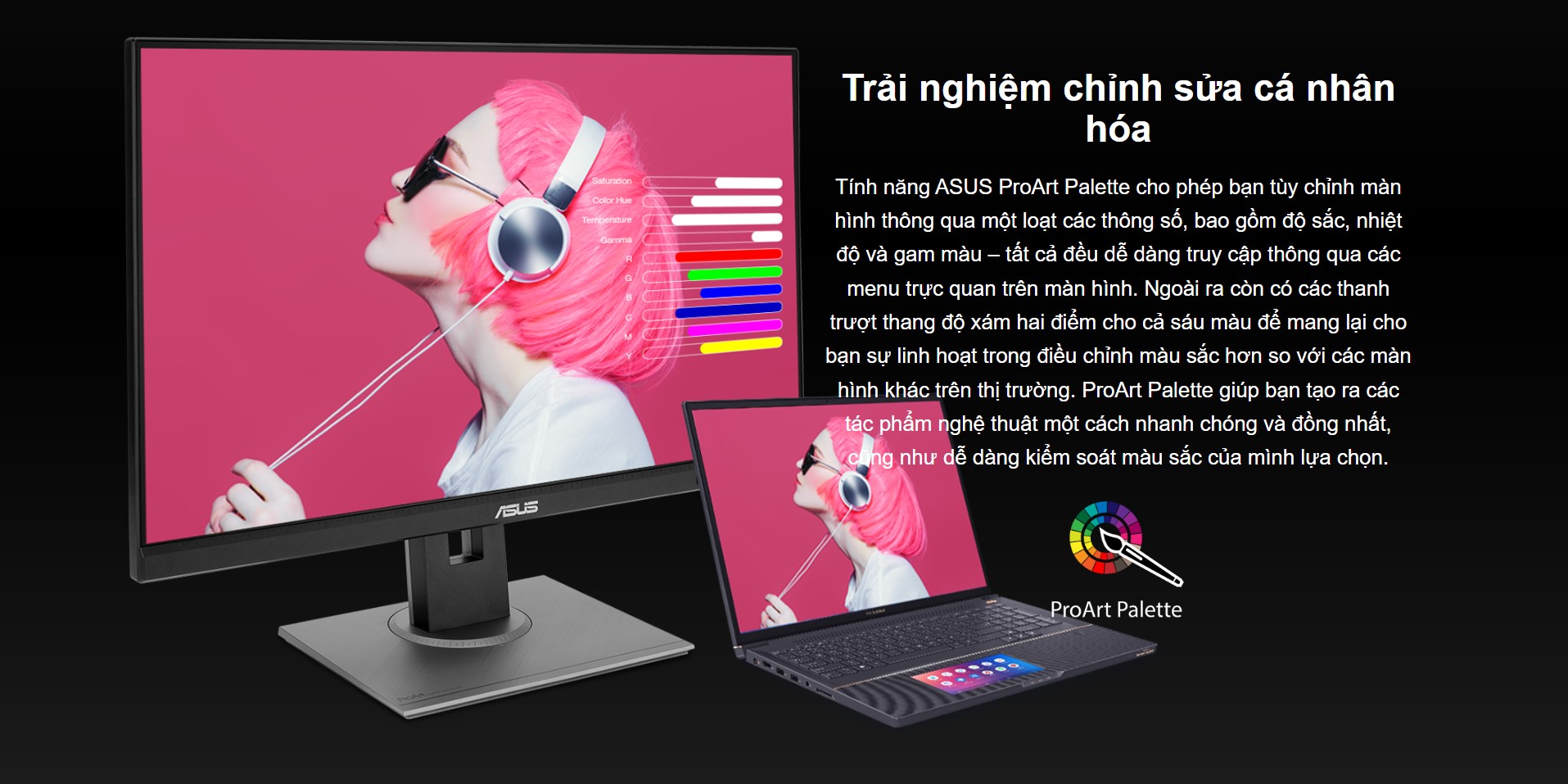 Để đáp ứng nhu cầu đa dạng của các chuyên gia sáng tạo, ASUS đã tích hợp các tính năng độc quyền ProArt Preset và ProArt Palette. Các chế độ ProArt Preset cho phép người dùng chuyển đổi nhanh chóng giữa các không gian màu được thiết lập sẵn, bao gồm sRGB, DCI-P3, Rec. 709, và nhiều chế độ chuyên biệt khác như "Rapid Rendering" hay "Darkroom".