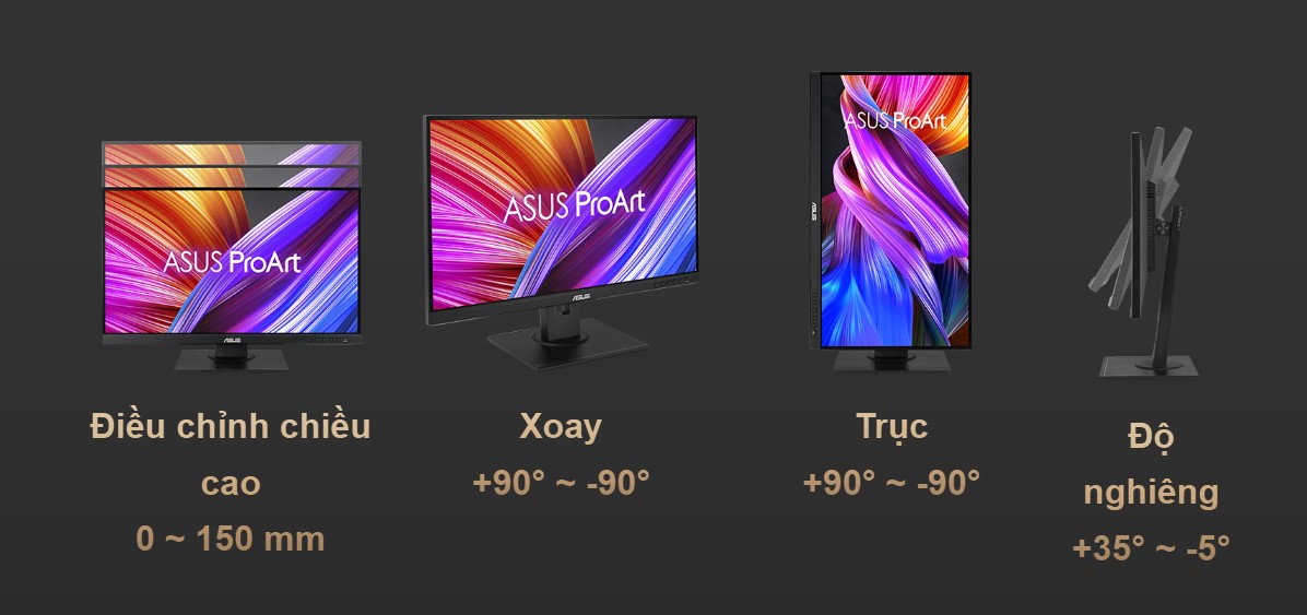 Công thái học là một yếu tố quan trọng đối với những người làm việc nhiều giờ liên tục. Màn hình ASUS ProArt PA278QEV được trang bị một chân đế đa năng, cho phép điều chỉnh linh hoạt mọi góc độ. Người dùng có thể tùy chỉnh độ cao (0~150mm), xoay ngang (Swivel) lên đến ±90°, xoay dọc (Pivot) lên đến ±90°, và nghiêng (Tilt) từ +35° đến -5°.
