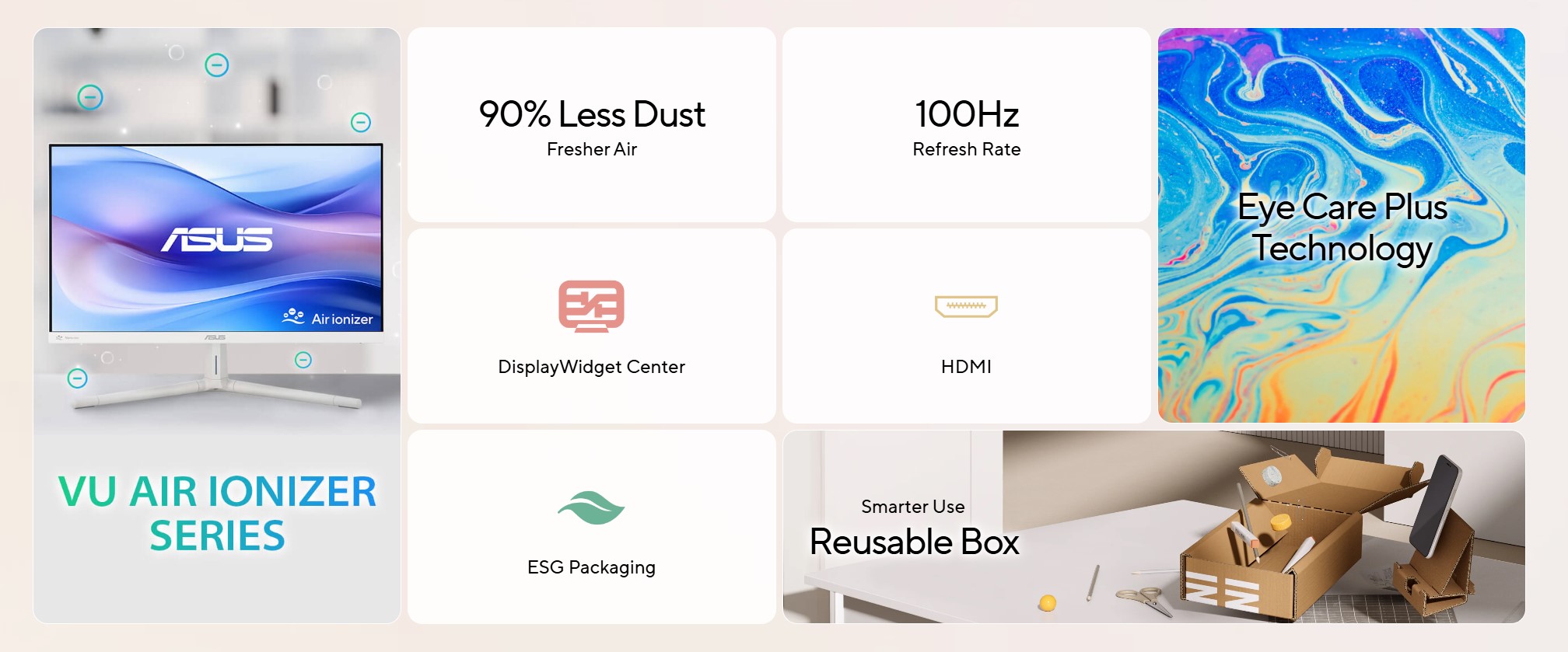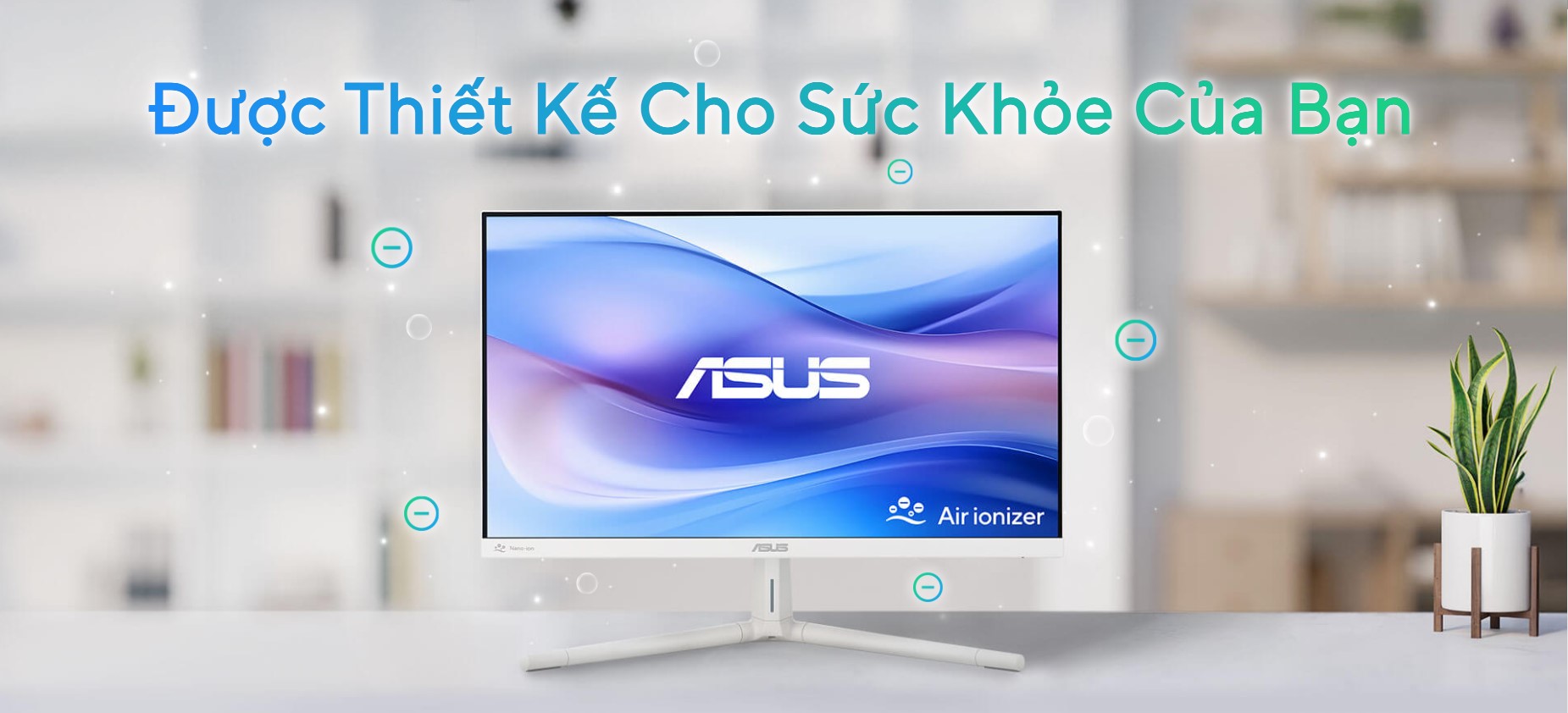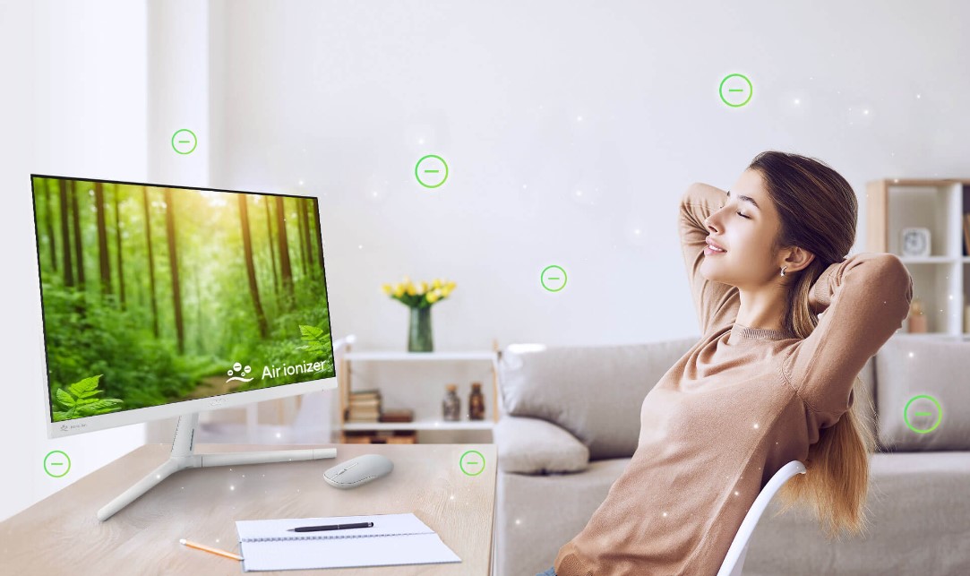 ASUS VU249HFI-W là một trong những màn hình tiên phong tích hợp các giải pháp bảo vệ sức khỏe người dùng một cách toàn diện, không chỉ dừng lại ở việc bảo vệ mắt mà còn cải thiện chất lượng không khí xung quanh.