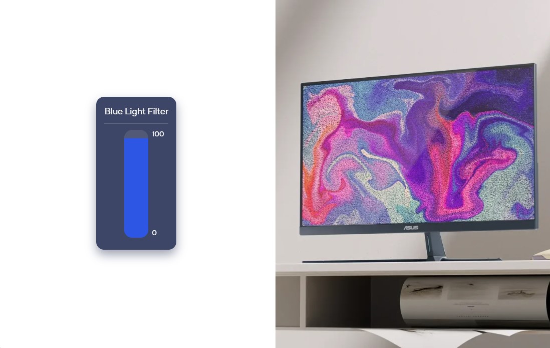 Low Blue Light Filter (Bộ lọc Ánh sáng Xanh): ASUS cung cấp bộ lọc ánh sáng xanh có thể điều chỉnh linh hoạt theo nhiều cấp độ khác nhau, cho phép người dùng tùy chỉnh để phù hợp với từng kịch bản sử dụng (ví dụ: làm việc văn bản, duyệt web, hoặc xem phim ban đêm).