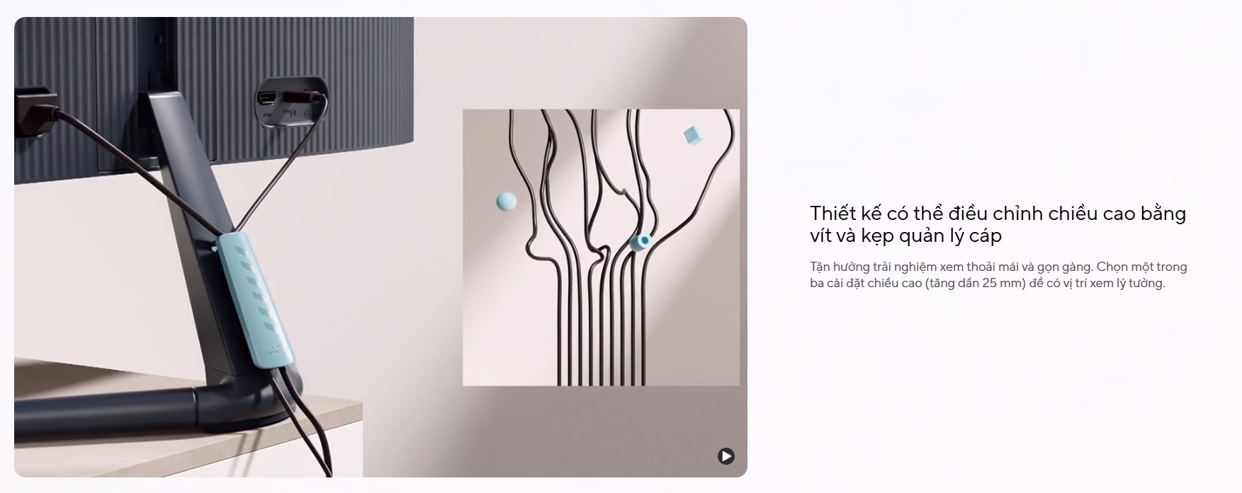 Quản Lý Cáp Tiện Lợi: Để duy trì sự gọn gàng cho setup tối giản, màn hình tích hợp kẹp quản lý cáp thông minh trên chân đế. Chi tiết nhỏ này giúp giữ cho dây cáp được sắp xếp ngăn nắp, loại bỏ sự lộn xộn trên bàn làm việc, hoàn thành yêu cầu khắt khe về sự sạch sẽ và gọn gàng của phong cách tối giản.