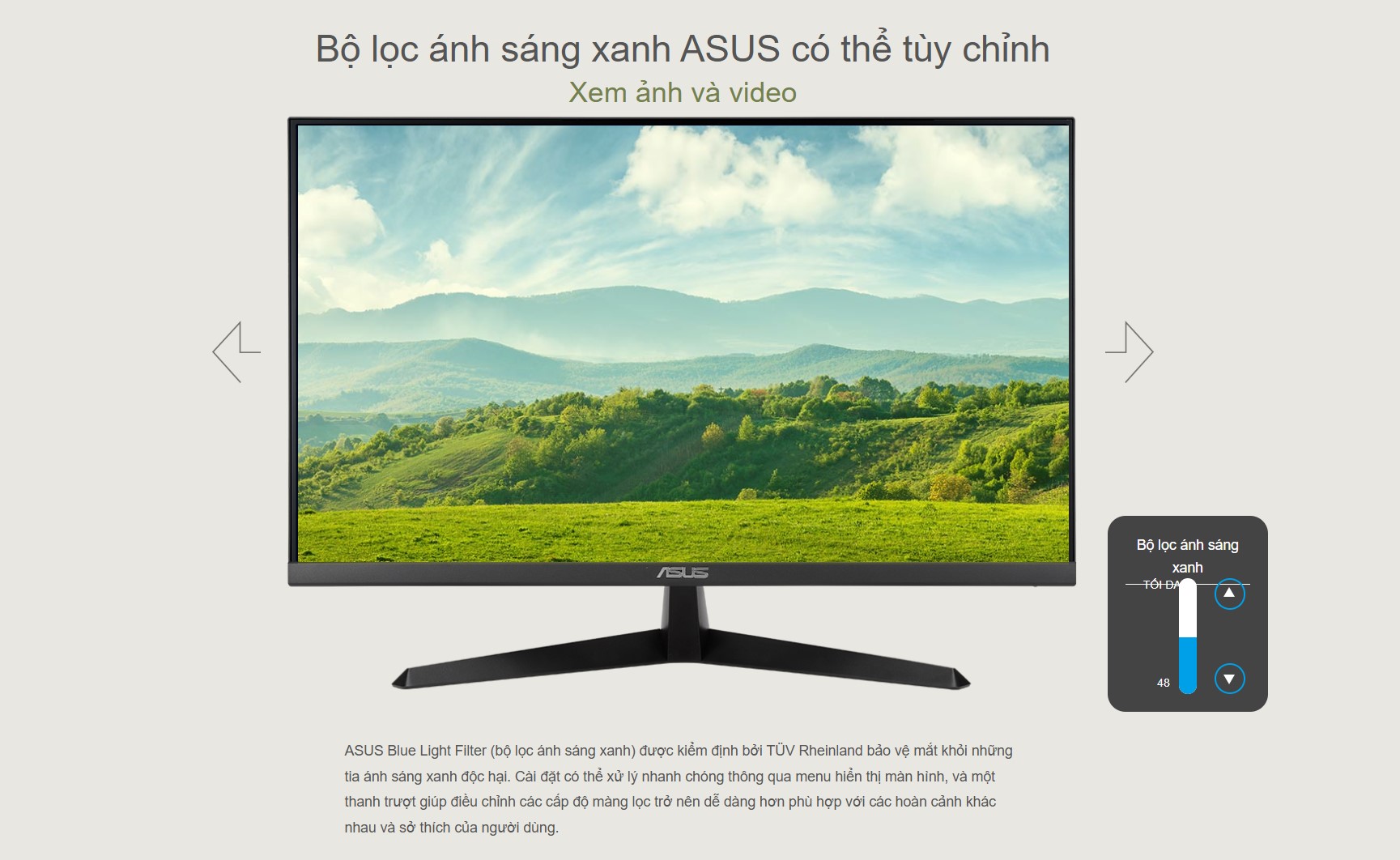 Bộ lọc Ánh sáng Xanh Tùy chỉnh (Adjustable Blue Light Filter): Công nghệ này giúp giảm phát xạ ánh sáng xanh năng lượng cao, một yếu tố gây hại tiềm tàng cho võng mạc và làm gián đoạn chu kỳ giấc ngủ. Bộ lọc ánh sáng xanh của ASUS VY229HF cho phép người dùng tùy chỉnh mức độ lọc từ 0 (không thay đổi) đến mức Tối đa, thông qua giao diện OSD. Điều này cho phép người dùng cân bằng linh hoạt giữa việc bảo vệ mắt tối đa và duy trì độ chính xác màu sắc khi cần (ví dụ, ở Chế độ Đọc sách - Reading Mode). Việc có thể điều chỉnh linh hoạt, đạt chuẩn TÜV Rheinland, củng cố vị thế của VY229HF là một màn hình chống mỏi mắt đáng tin cậy.