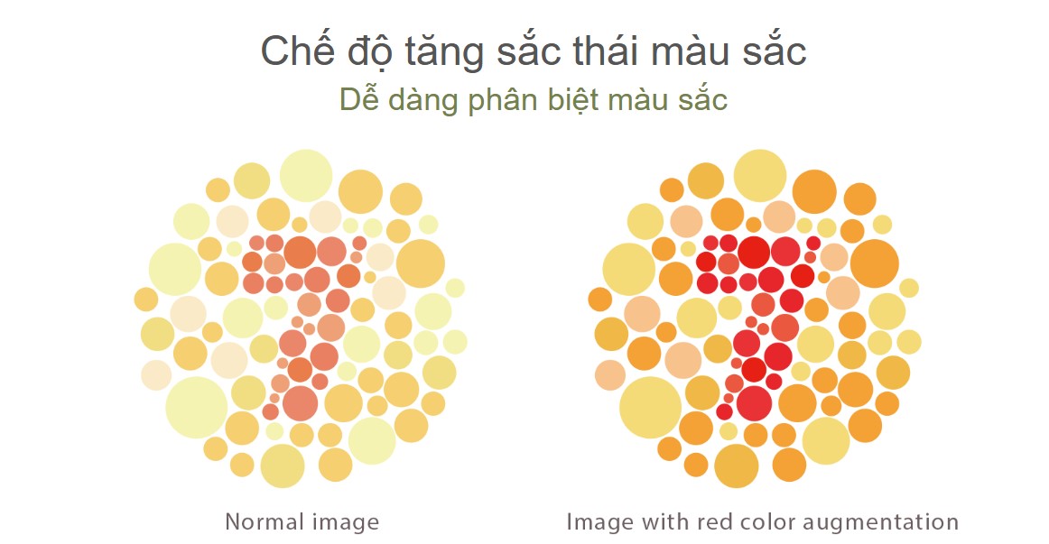 Chế độ Tăng cường Màu sắc (Color Augmentation Mode): Đây là một công cụ hỗ trợ mang tính nhân văn, giúp người dùng bị khiếm thị màu sắc (color-vision deficiency). Chế độ này cho phép người dùng tùy chỉnh các sắc thái màu cơ bản trên màn hình (đỏ, xanh lá, vàng, xanh dương) thành các màu dễ phân biệt hơn. Khả năng cá nhân hóa cao này giúp nâng cao đáng kể trải nghiệm xem, làm việc và học tập cho nhóm người dùng này, một tính năng khó tìm thấy ở các màn hình văn phòng giá rẻ thông thường.