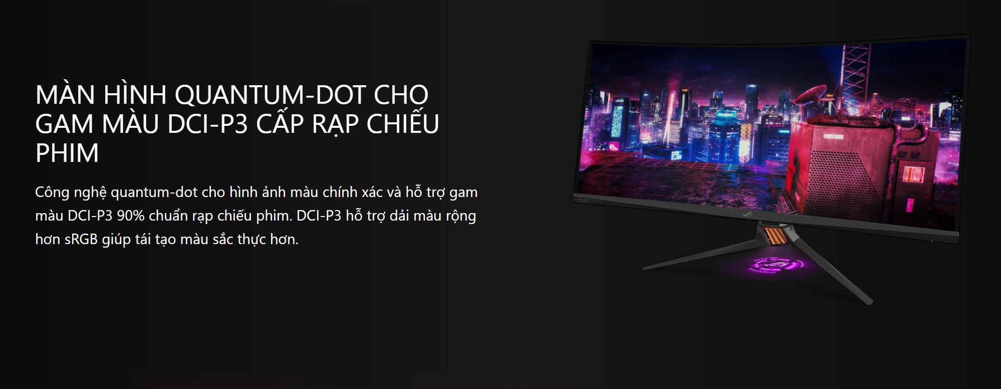 Để đạt được màu sắc sống động và chuẩn xác, PG35VQ sử dụng lớp màng Quantum Dot (Chấm lượng tử). Công nghệ này cho phép màn hình mở rộng không gian màu lên đến 90% dải màu DCI-P3, vốn là tiêu chuẩn thường được sử dụng trong ngành điện ảnh. So với các màn hình văn phòng thông thường chỉ đạt dải màu sRGB, PG35VQ mang lại sự khác biệt rõ rệt về độ bão hòa và độ tươi của màu sắc.