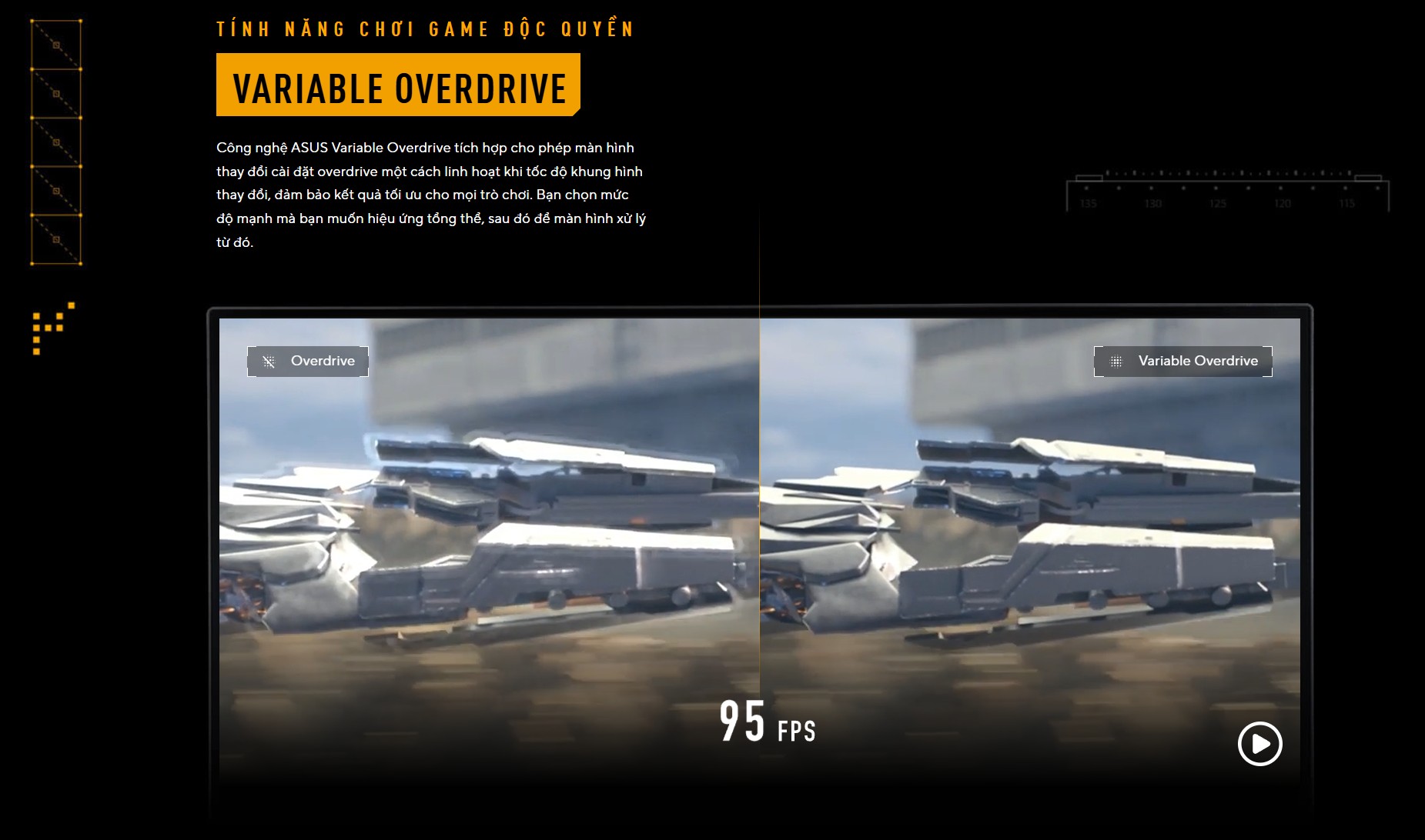 Một tính năng cực kỳ đắt giá trên VG279QE5A chính là ASUS Variable Overdrive. Công nghệ này cho phép màn hình tự động thay đổi cài đặt overdrive một cách linh hoạt dựa trên sự biến thiên của tốc độ khung hình (FPS). Dù bạn đang ở trong những cảnh hành động tốc độ cao hay những phân đoạn chậm rãi, màn hình luôn đảm bảo hiệu quả khử nhòe tối ưu nhất mà không cần bạn phải tùy chỉnh thủ công.