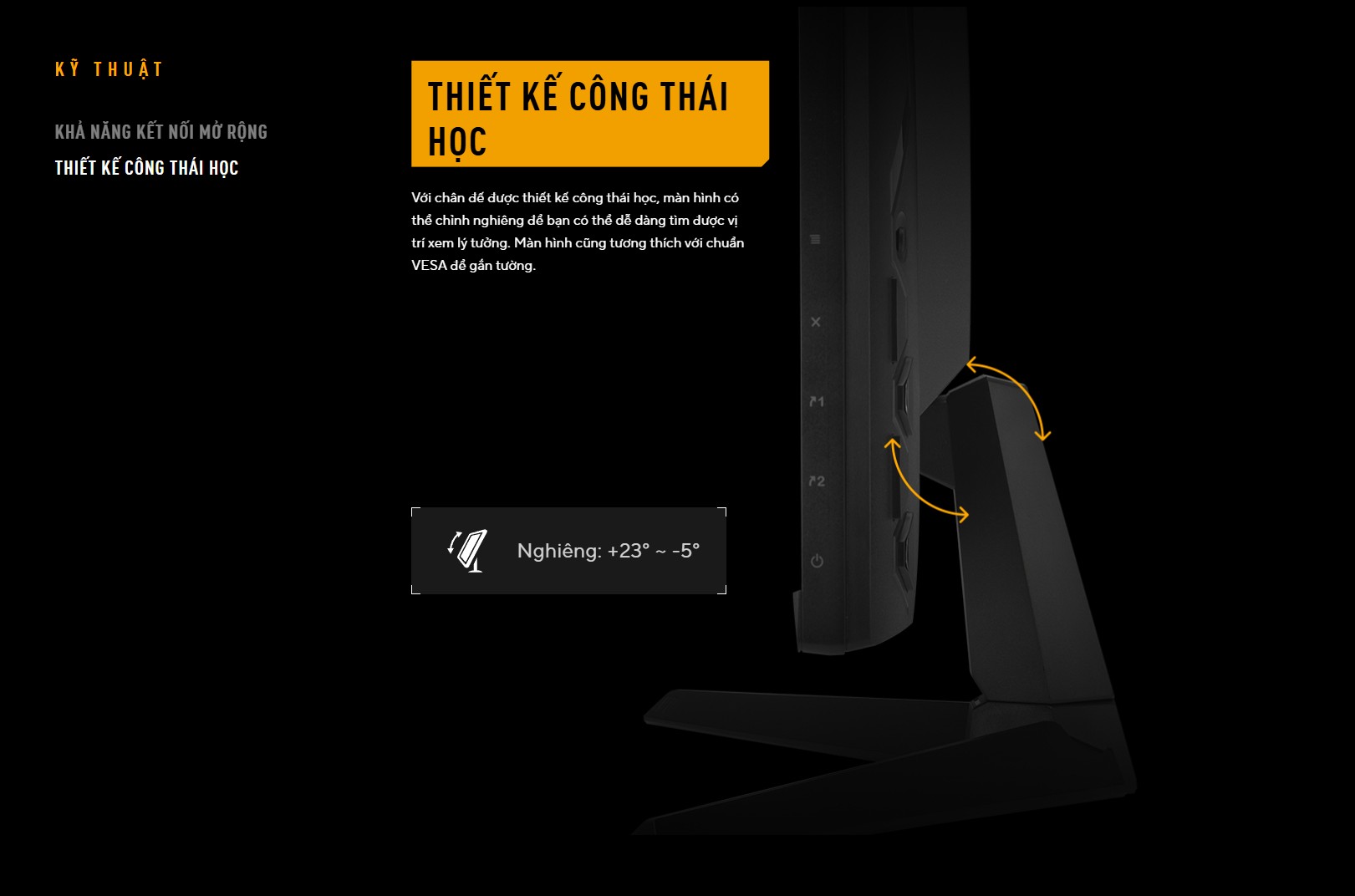 Chân đế công thái học: Cho phép điều chỉnh độ nghiêng (+23° ~ -5°) để có góc nhìn thoải mái nhất.