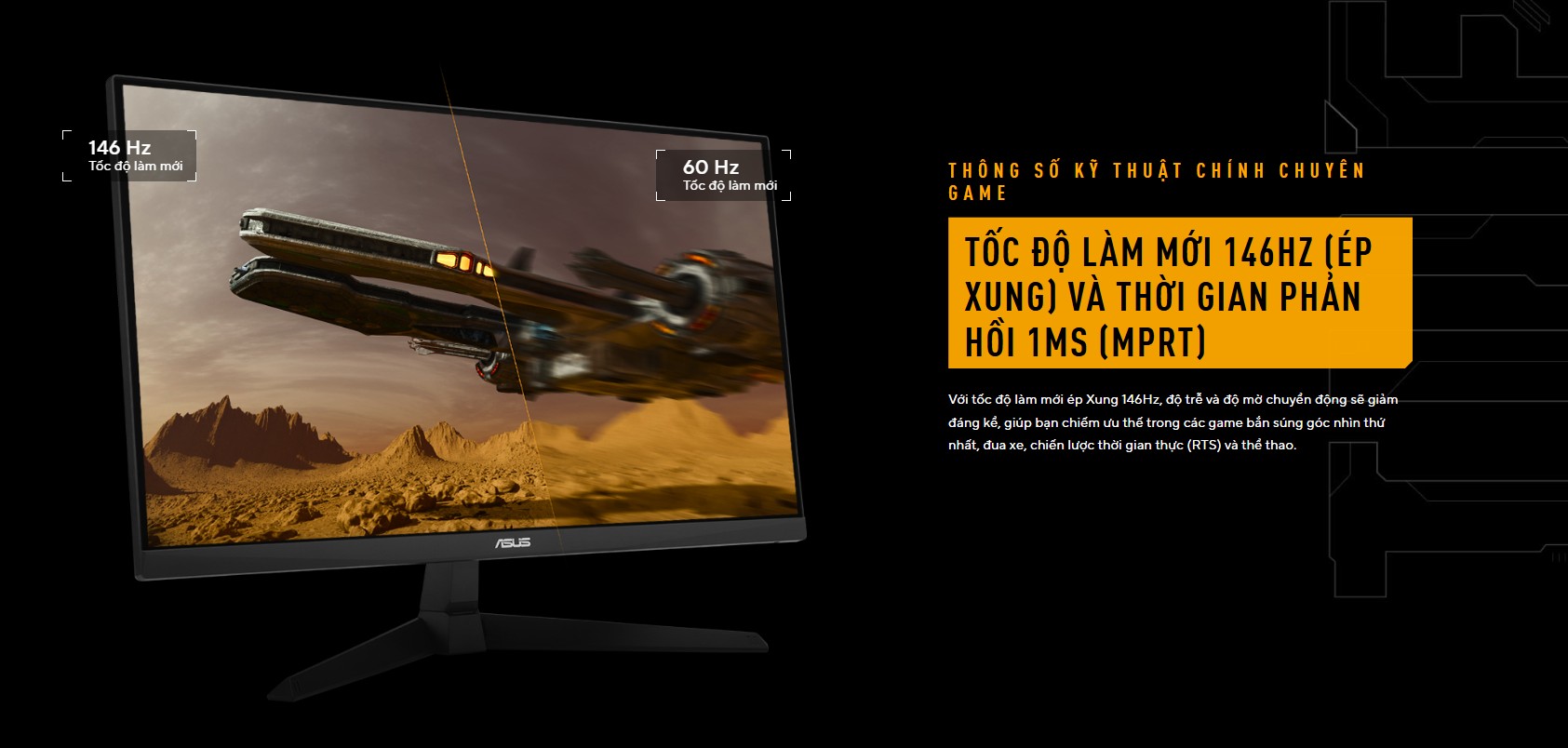 Tốc độ là linh hồn của dòng TUF Gaming. Với khả năng ép xung lên đến 146Hz, mọi chuyển động của nhân vật, đường đạn hay những khúc cua gắt trong đua xe đều được tái hiện trơn tru đến kinh ngạc.