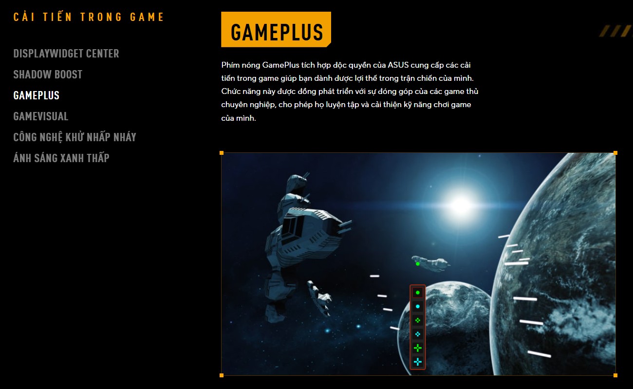 Được phát triển dựa trên ý kiến của các game thủ chuyên nghiệp, tính năng GamePlus tích hợp các công cụ hỗ trợ trực tiếp trên màn hình như: