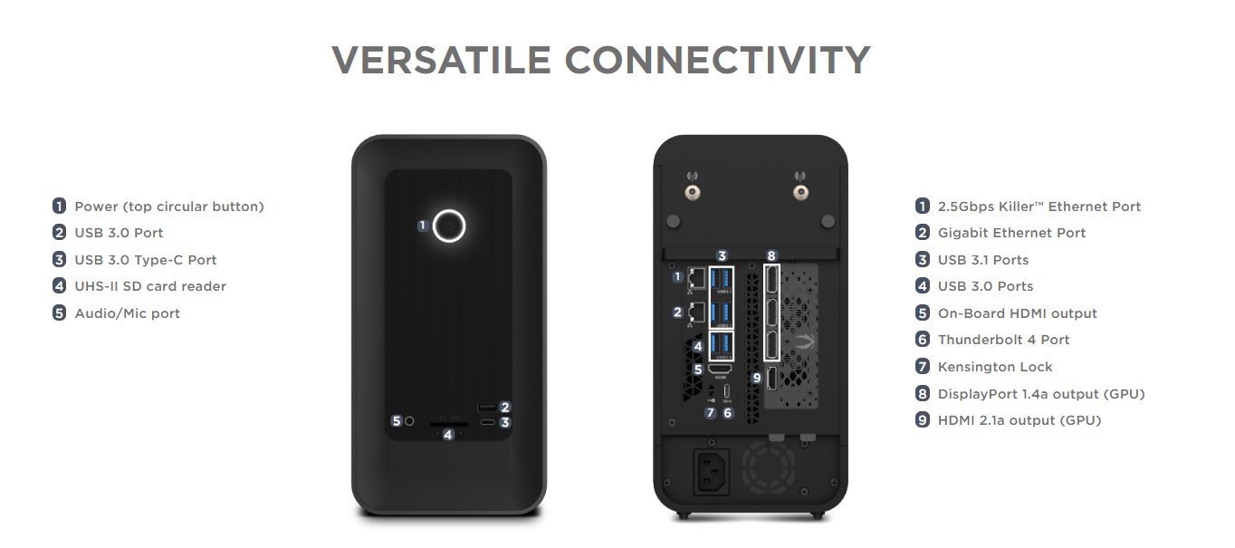 Hệ thống cổng kết nối của MAGNUS ONE vô cùng đa dạng, đáp ứng mọi nhu cầu từ cơ bản đến chuyên nghiệp. Ở mặt trước, máy có đầu đọc thẻ UHS-II, cổng USB 3.0 Type-C và các cổng USB Type-A. Mặt sau được trang bị đầy đủ các cổng USB 3.1 Gen2 và USB 3.0, cùng với cổng Thunderbolt 4 đa năng.