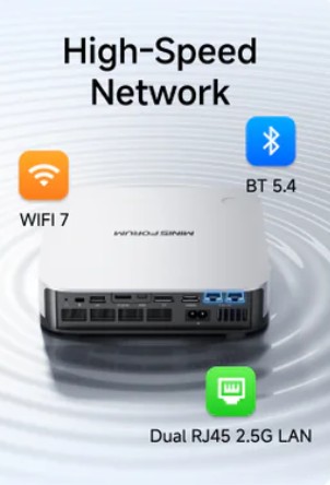 Bên cạnh đó, hai cổng Ethernet 2.5GbE mang lại kết nối mạng ổn định, lý tưởng cho chơi game trực tuyến, truyền tải dữ liệu lớn hoặc làm việc từ xa. Về không dây, Minisforum AI X1 Pro hỗ trợ WiFi 7 và Bluetooth 5.4, mang đến tốc độ và độ tin cậy hàng đầu.