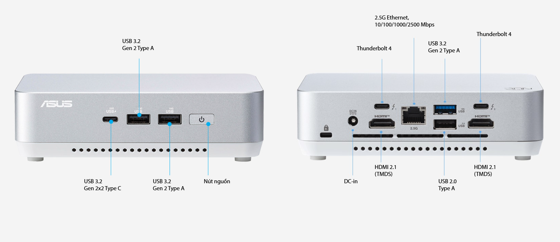 Máy hỗ trợ đầy đủ các cổng kết nối hiện đại như USB 4, HDMI, LAN và hỗ trợ xuất ra nhiều màn hình cùng lúc, giúp ASUS NUC 14 Pro+ RNUC14RVSU500001I trở thành trung tâm kết nối cho mọi thiết bị ngoại vi và hệ thống hiển thị.