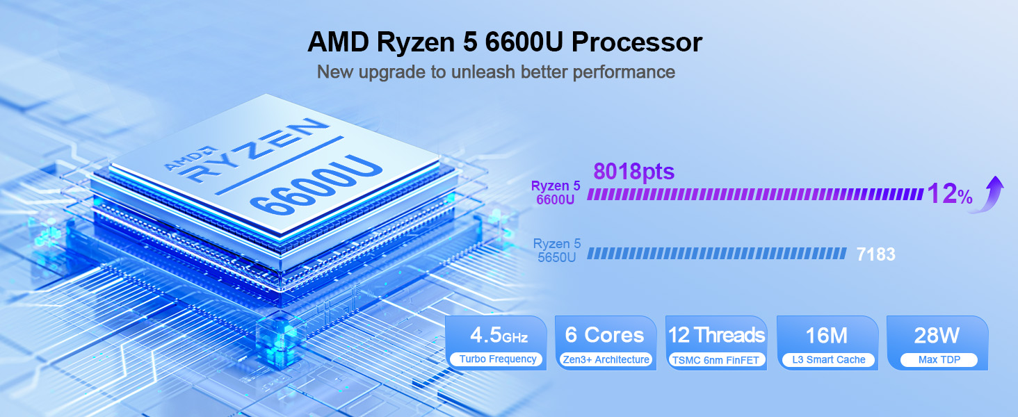| CPU | AMD Ryzen™ 5 6600U 6C/12T 4.5GHz CPU Mark 19.000 |