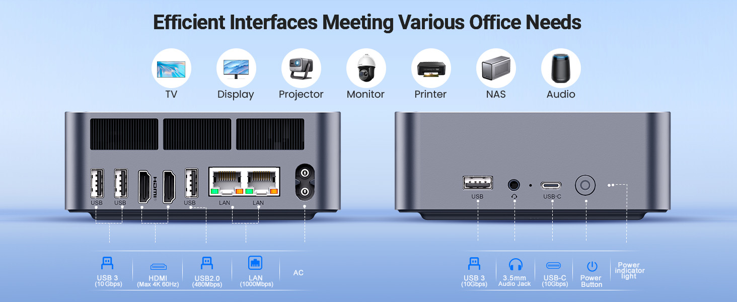 | Cổng IO | 1x USB C (data) 3x USB 3.0 10Gbps 1x USB 2.0 480Mbps 2x HDMI 2x Lan 1x 3.5 Audio Jack |