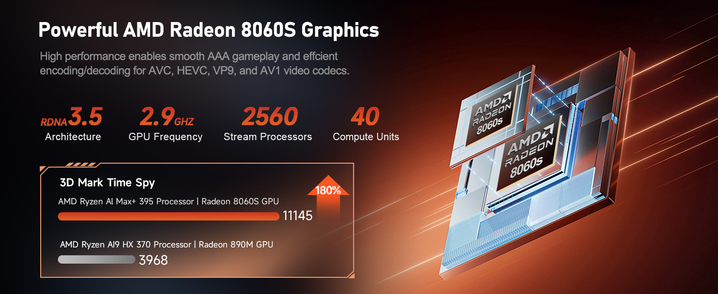 Mini PC này được trang bị GPU tích hợp AMD Radeon 8060S Graphics với kiến trúc RDNA 3.5 và 40 Đơn vị Tính toán (CUs). Hiệu năng của Radeon 8060S được đánh giá là ngang ngửa với card đồ họa rời NVIDIA RTX 4060, cho phép GTR9 Pro xử lý mượt mà các tựa game AAA hiện đại ở độ phân giải cao.