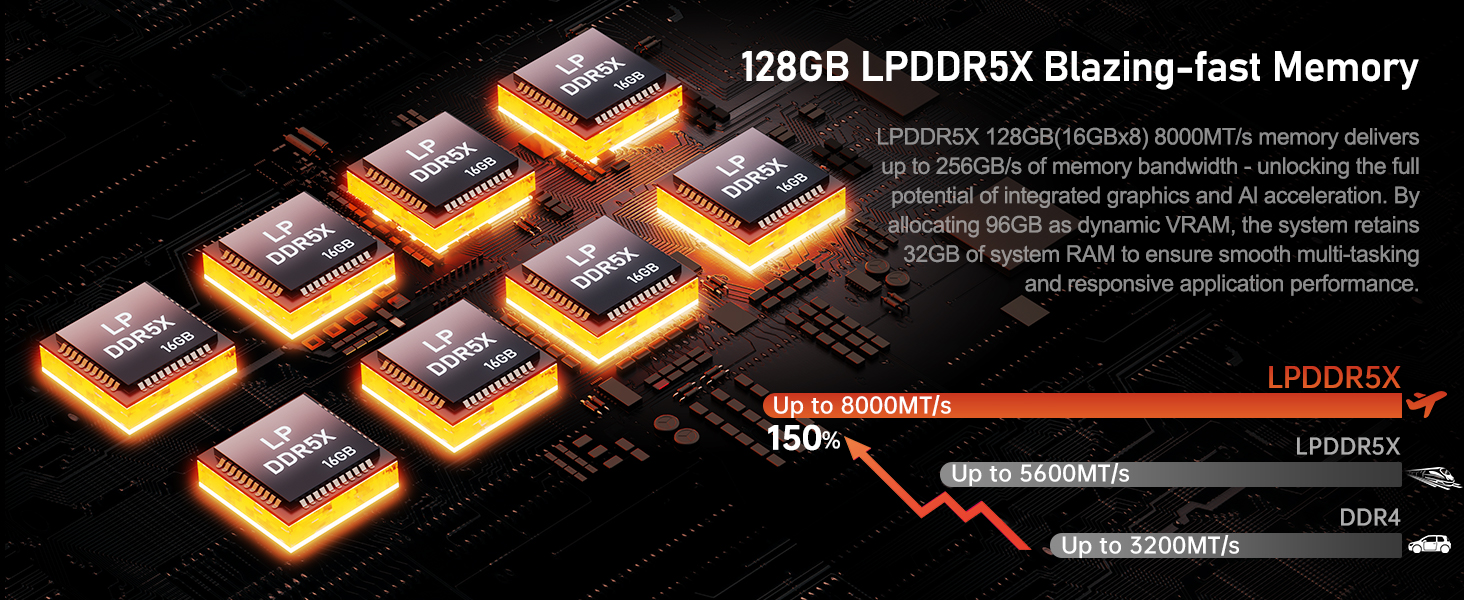 Beelink GTR9 Pro được trang bị bộ nhớ RAM cao cấp 128GB LPDDR5X bus 8000MT/s. Mặc dù RAM được hàn vào bo mạch (không thể nâng cấp), dung lượng 128GB và tốc độ cực cao 8000MT/s đảm bảo Mini PC này có đủ khả năng để xử lý các dự án AI, chỉnh sửa video đa luồng 8K và chạy nhiều máy ảo cùng lúc mà không bị nghẽn cổ chai bộ nhớ.