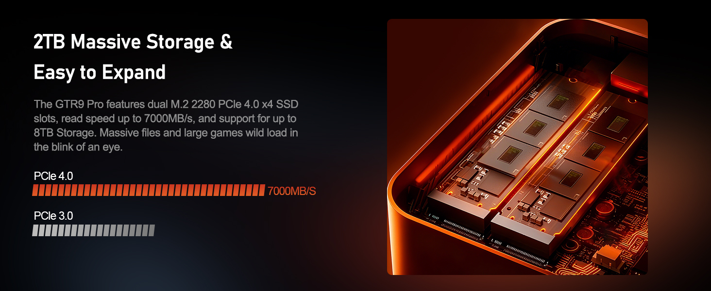 Về lưu trữ, GTR9 Pro cung cấp hai khe cắm M.2 2280 PCIe 4.0 x4 SSD. Điều này cho phép người dùng tùy chọn cấu hình lưu trữ lên tới 8TB mỗi khe, với tổng dung lượng 16TB, mang lại không gian lưu trữ rộng rãi và tốc độ truy xuất dữ liệu cực nhanh. Tốc độ PCIe 4.0 là lý tưởng cho việc xử lý các tệp dự án dung lượng lớn, tăng tốc độ khởi động hệ điều hành và tải ứng dụng.
