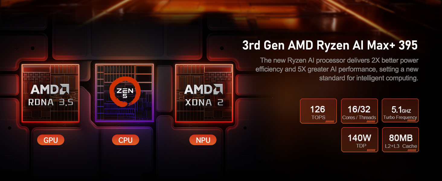 Thành phần then chốt của GTR9 Pro là Bộ xử lý thần kinh (NPU - Neural Processing Unit) dựa trên kiến trúc XDNA 2 thế hệ mới. NPU này có khả năng xử lý 50 TOPS (Tera Operations Per Second) riêng biệt. Kết hợp với CPU Zen 5 và GPU Radeon 8060S, tổng hiệu suất tính toán AI của bộ vi xử lý Ryzen AI Max+ 395 đạt đến mức ấn tượng 126 TOPS.