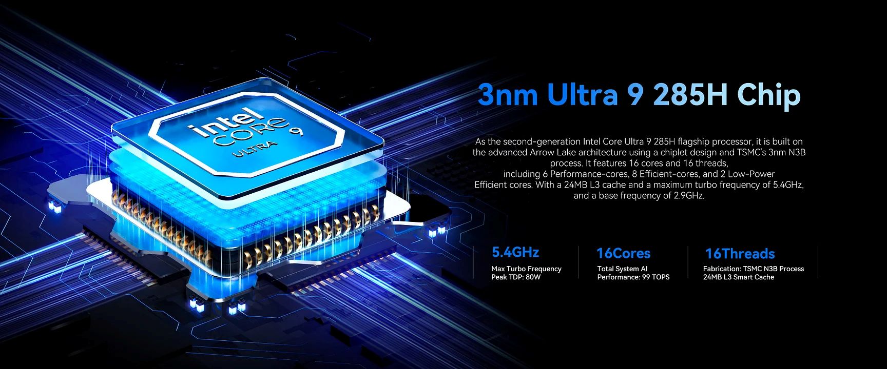 | CPU | Core Ultra 9 285H (16C/16T, 5.4 GHz) CPU Mark 40.000 |